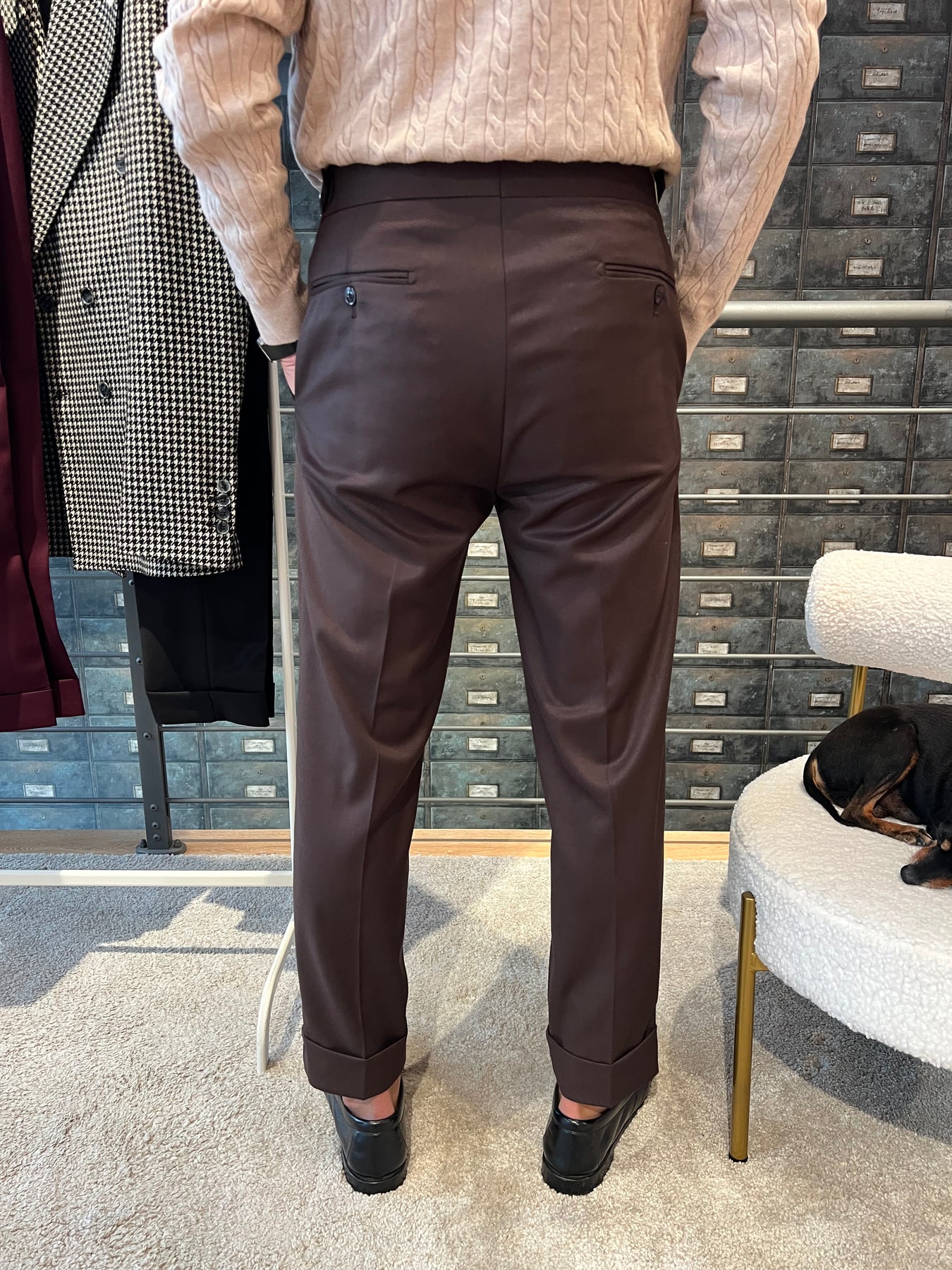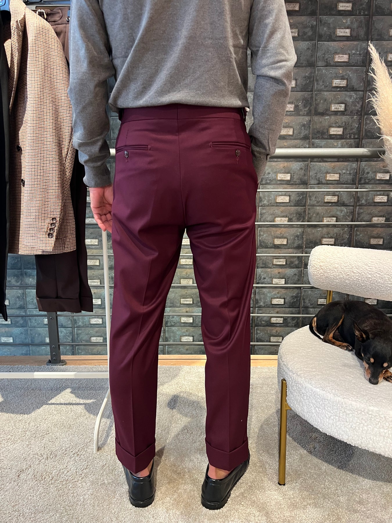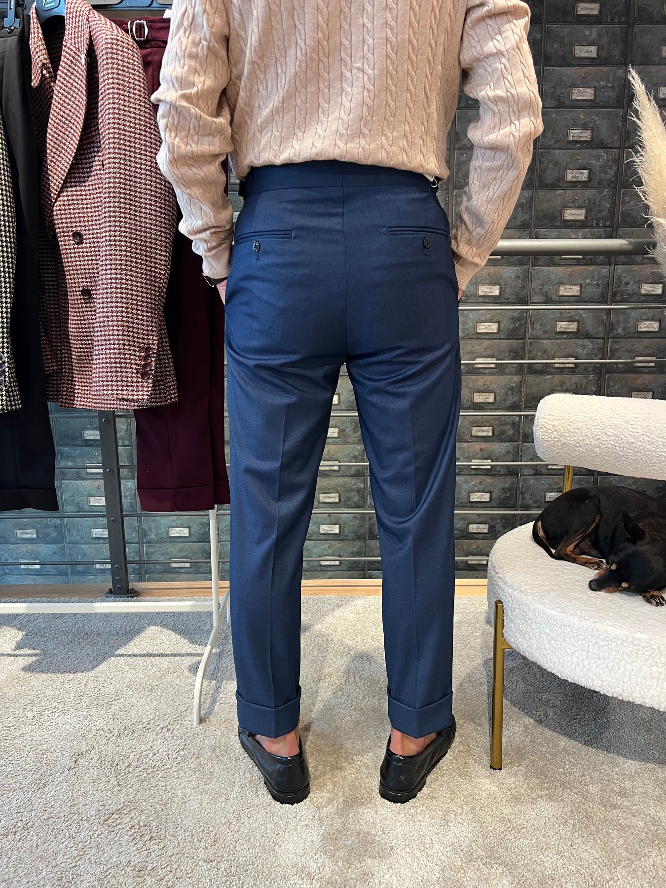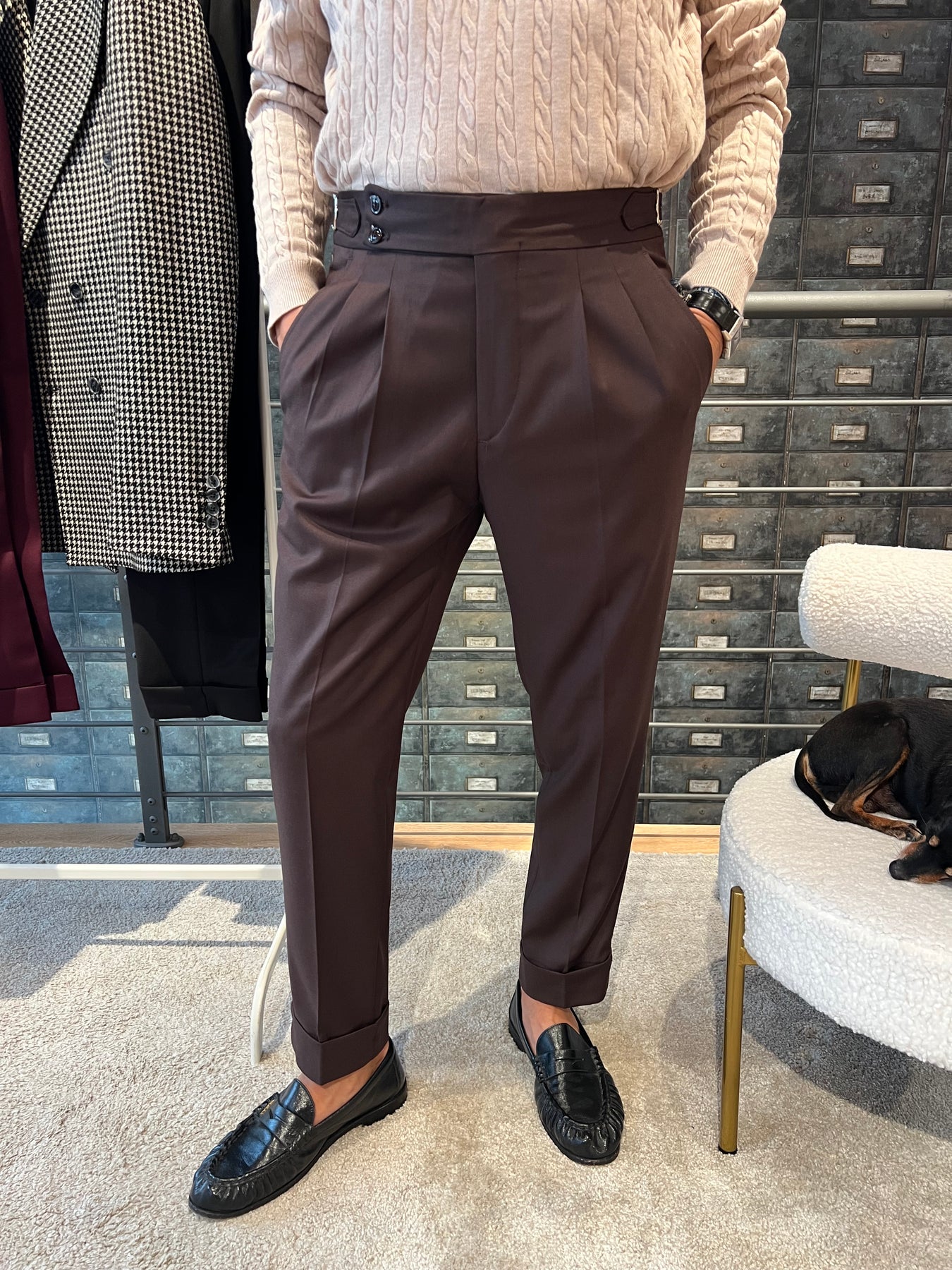 Pantaloni dal taglio slim a vita alta con pinces e fibbie laterali, fondo asciutto con risvolto.