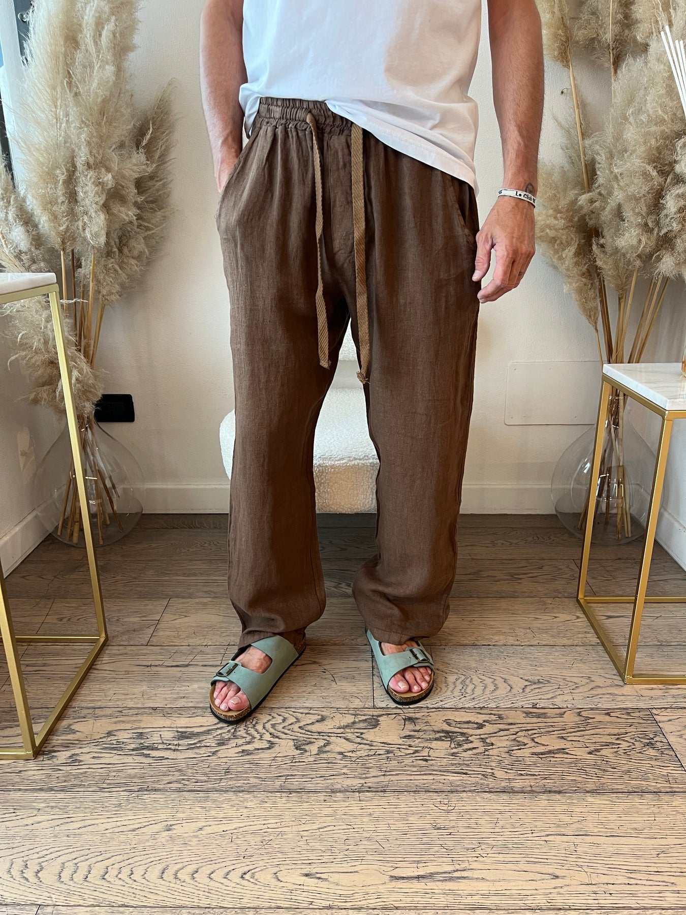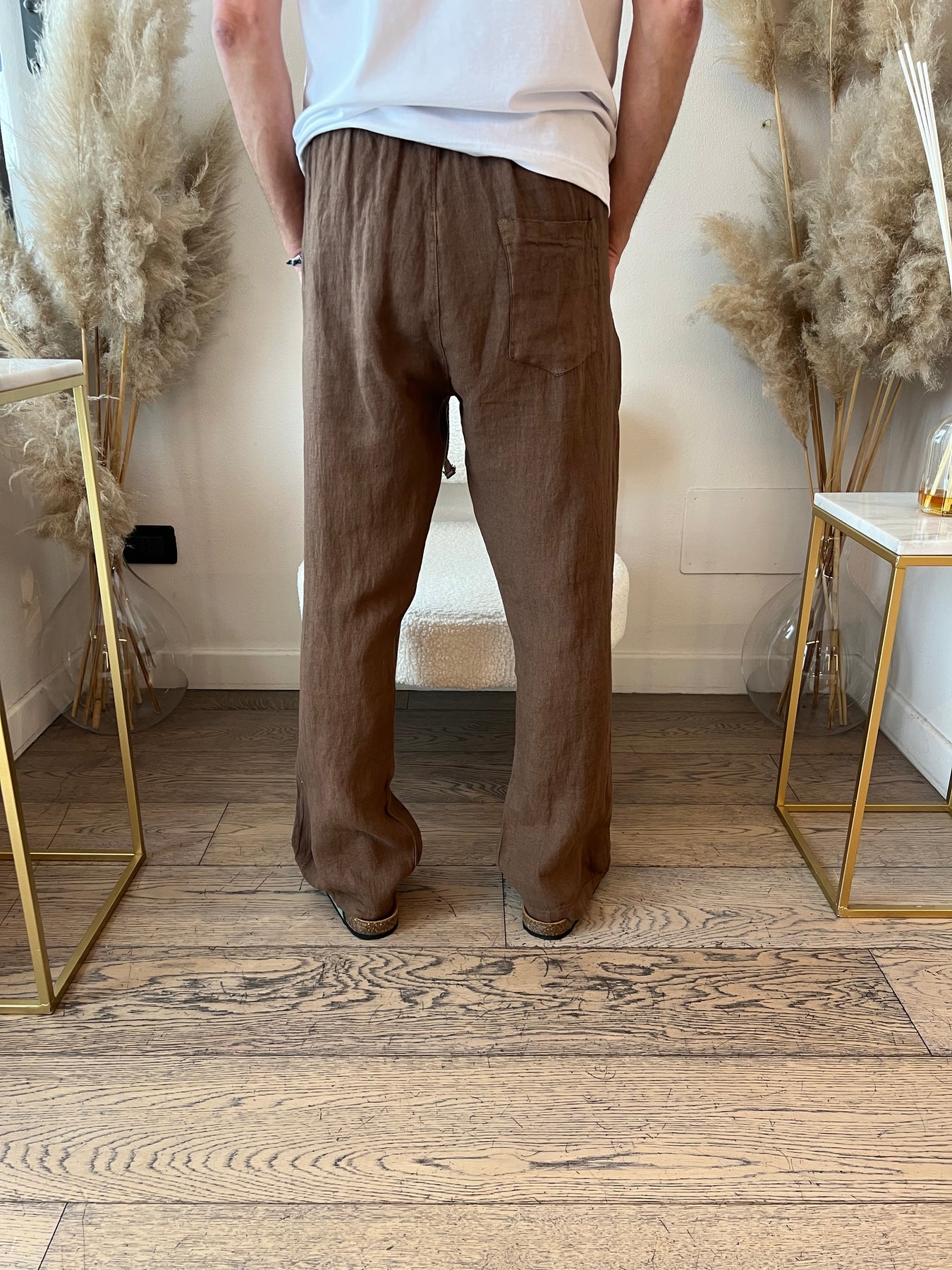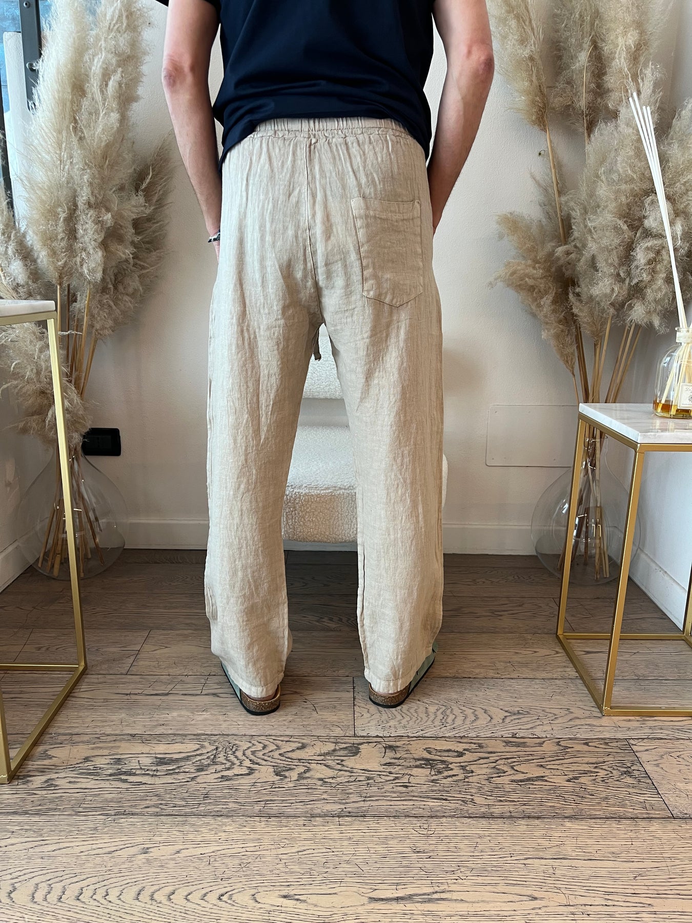 Pantaloni in lino a gamba dritta con elastico in vita.