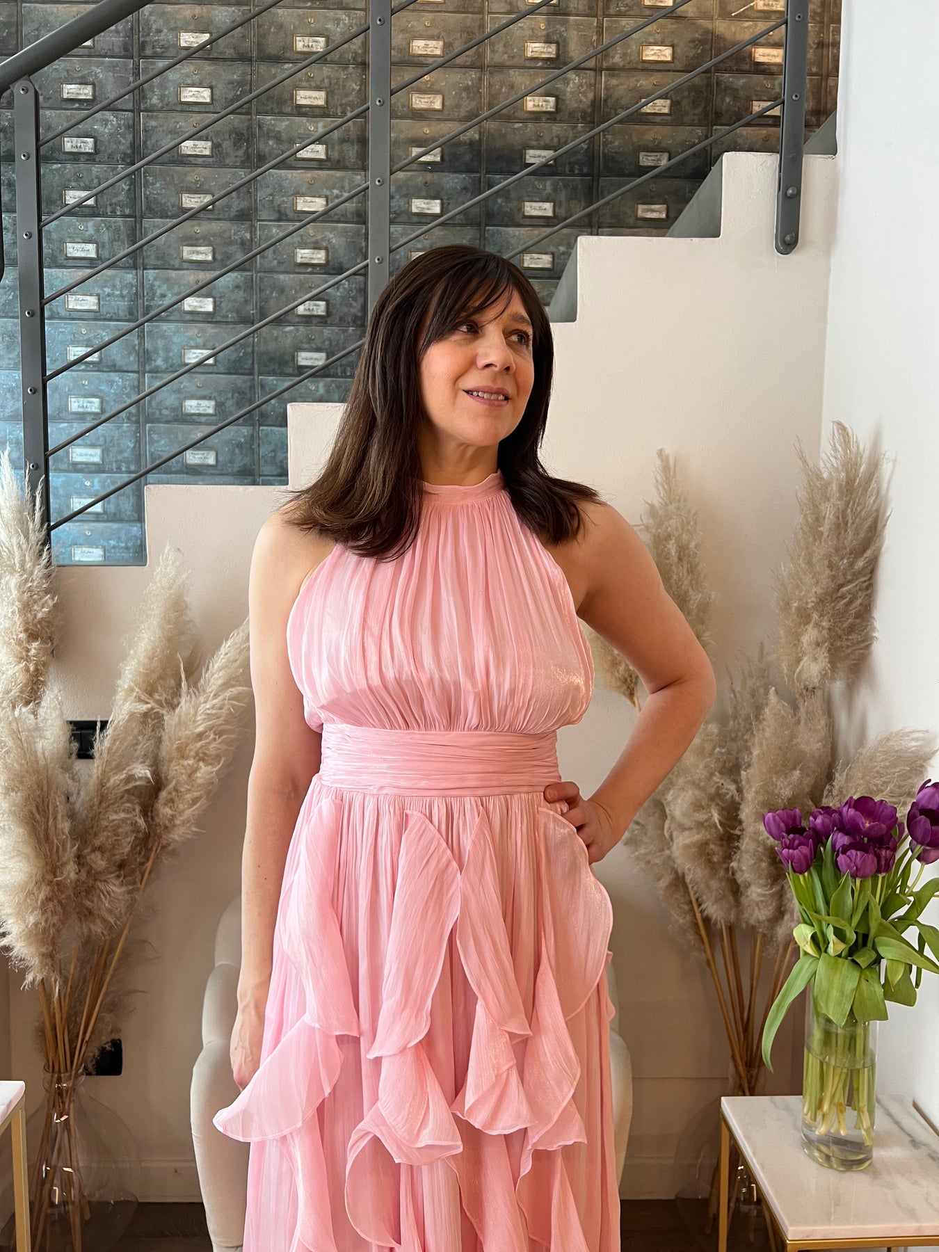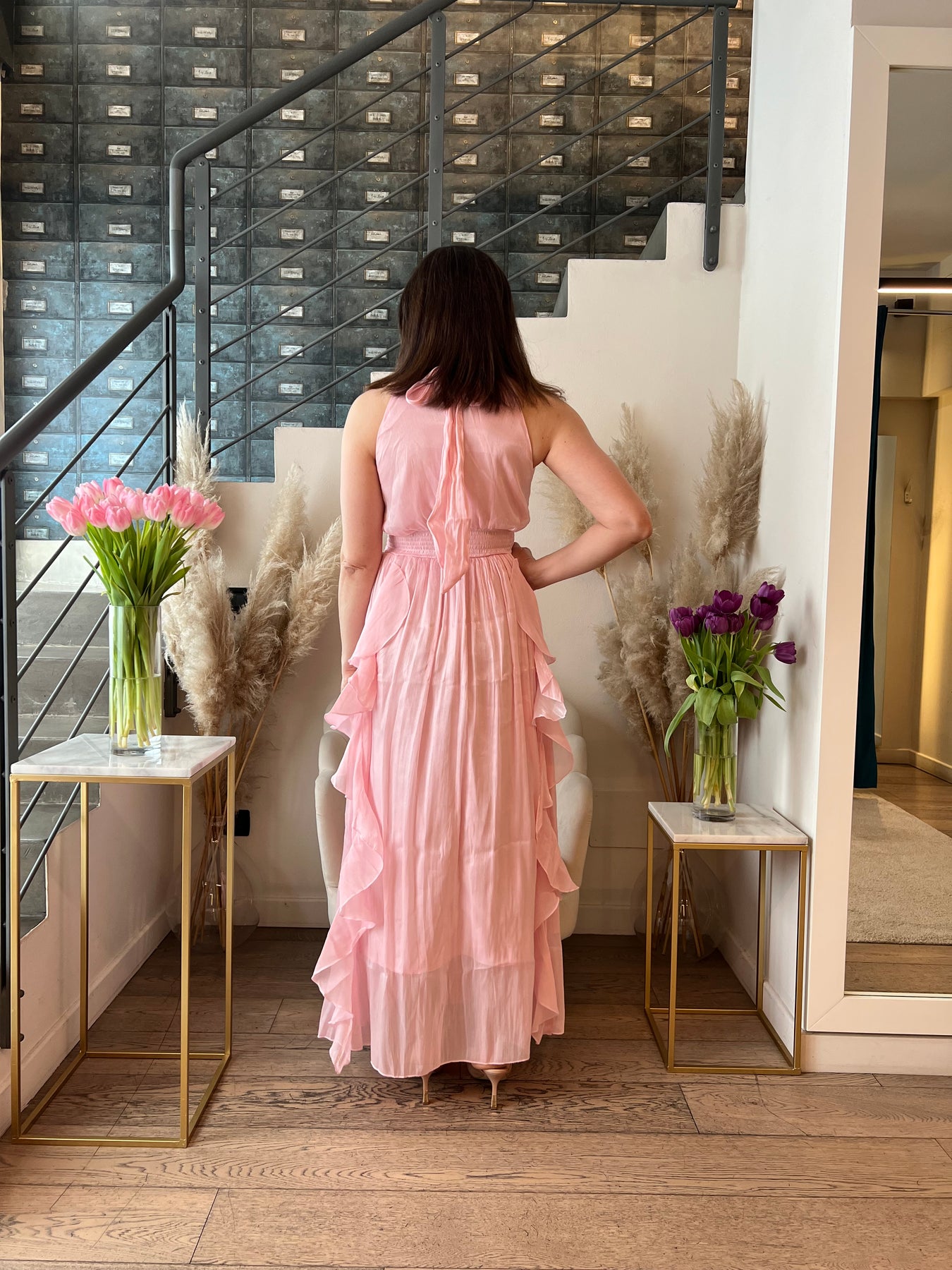 Abito lungo in tessuto lucido con top girocollo morbido, elastico nella parte posteriore della vita e gonna ampia con rouches. Veste dal 40 ala 44