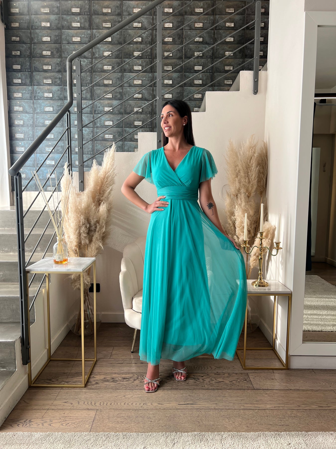 Abito lungo in tulle doppiato morbidissimo. Corpetto con scollo incrociato, coppette preformate e maniche a petalo. Gonna lunga e fascia in vita regolabile nella schiena con un fiocco. Veste dalla 40 alla 46