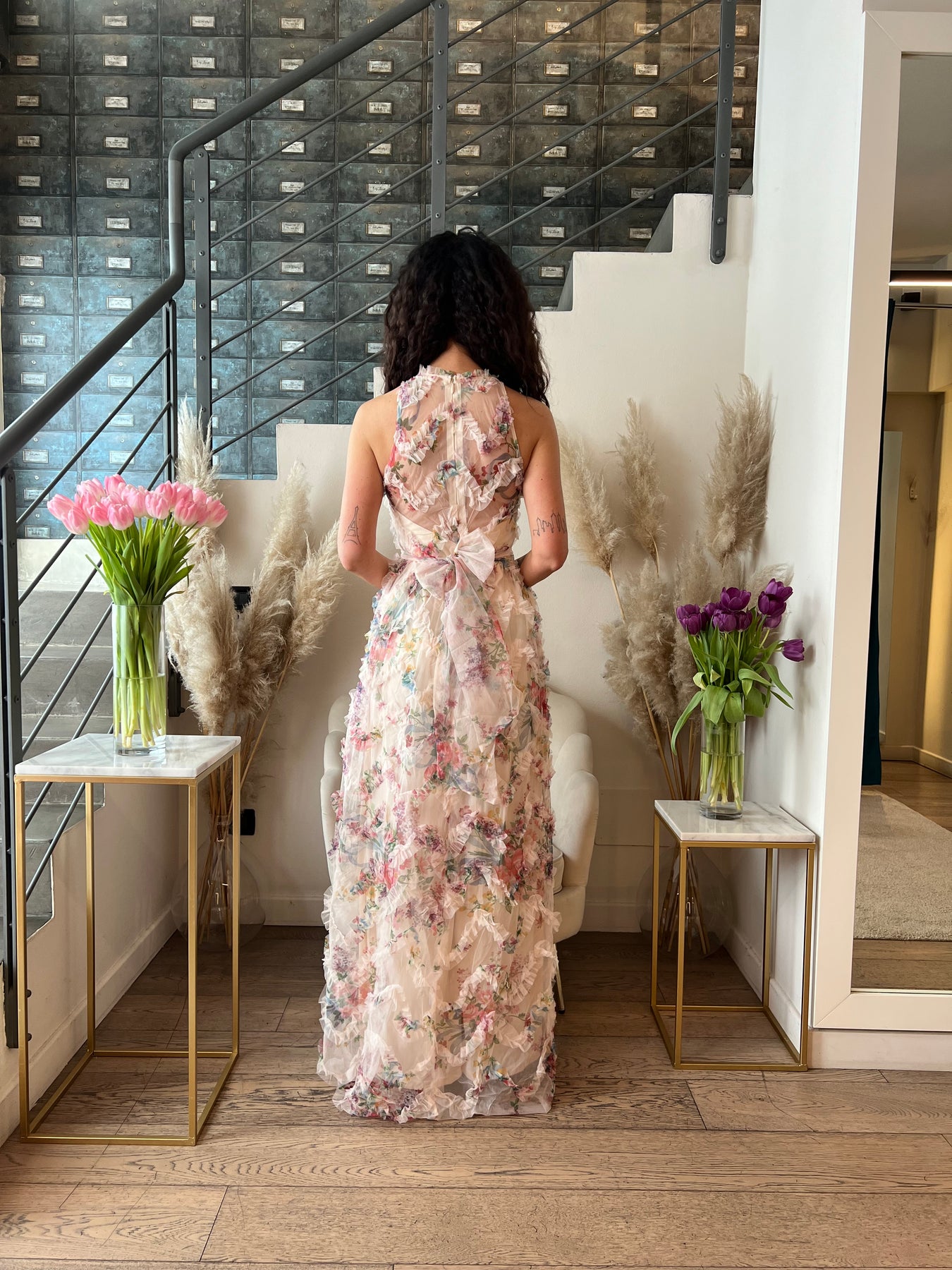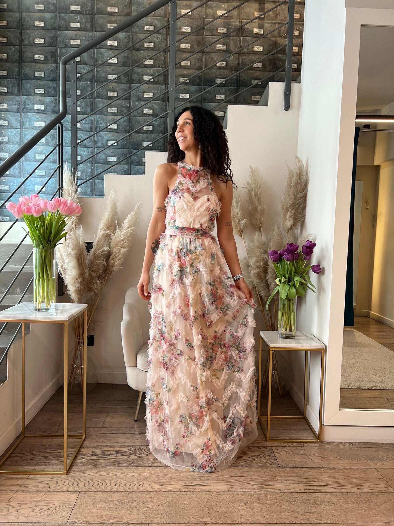 Abito lungo in fantasia floreale con top senza maniche, coppette preformate, fascia in vita da chiudere con fiocco e gonna con rouches