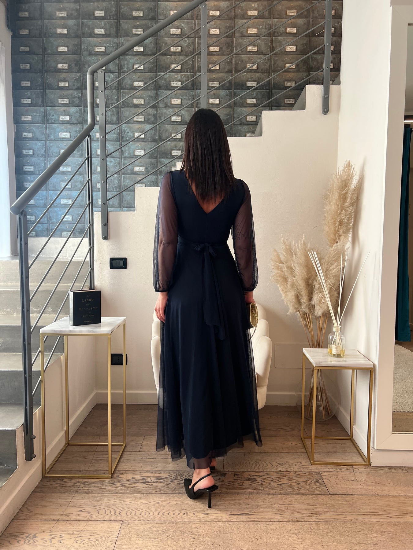 Abito lungo in tulle doppiato con scollo asimmetrico,coppette preformate, punto vita segnato e gonna morbida. Veste dalla 40 alla 46