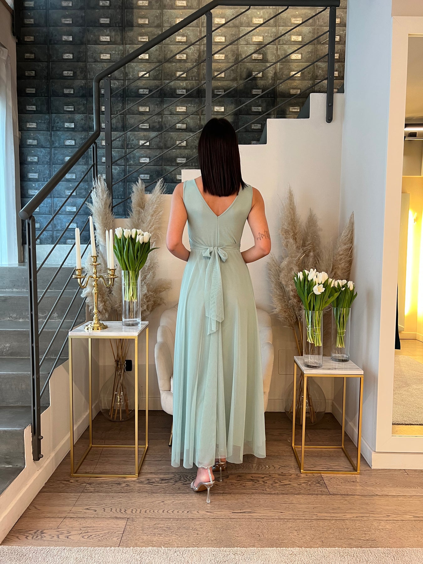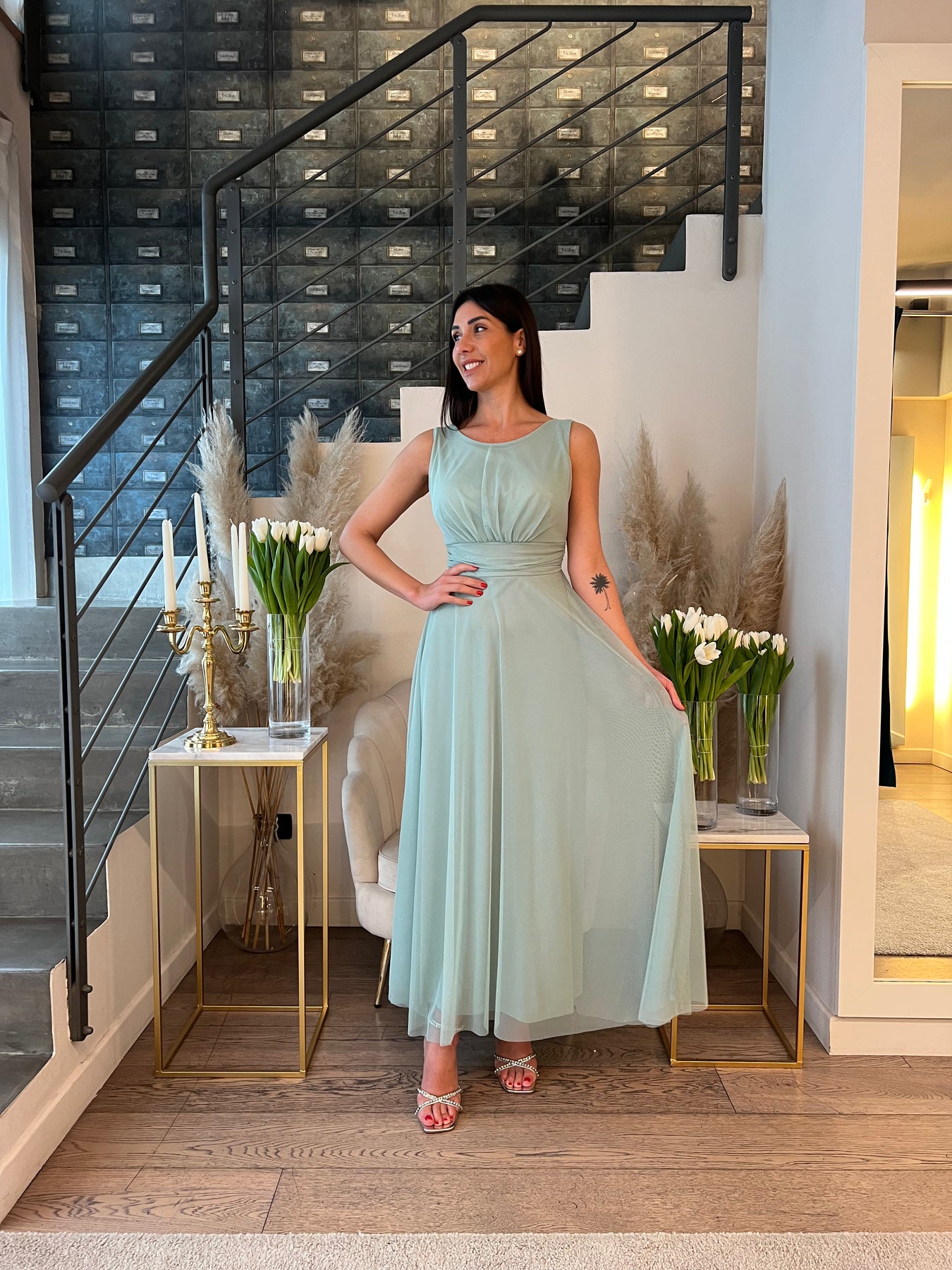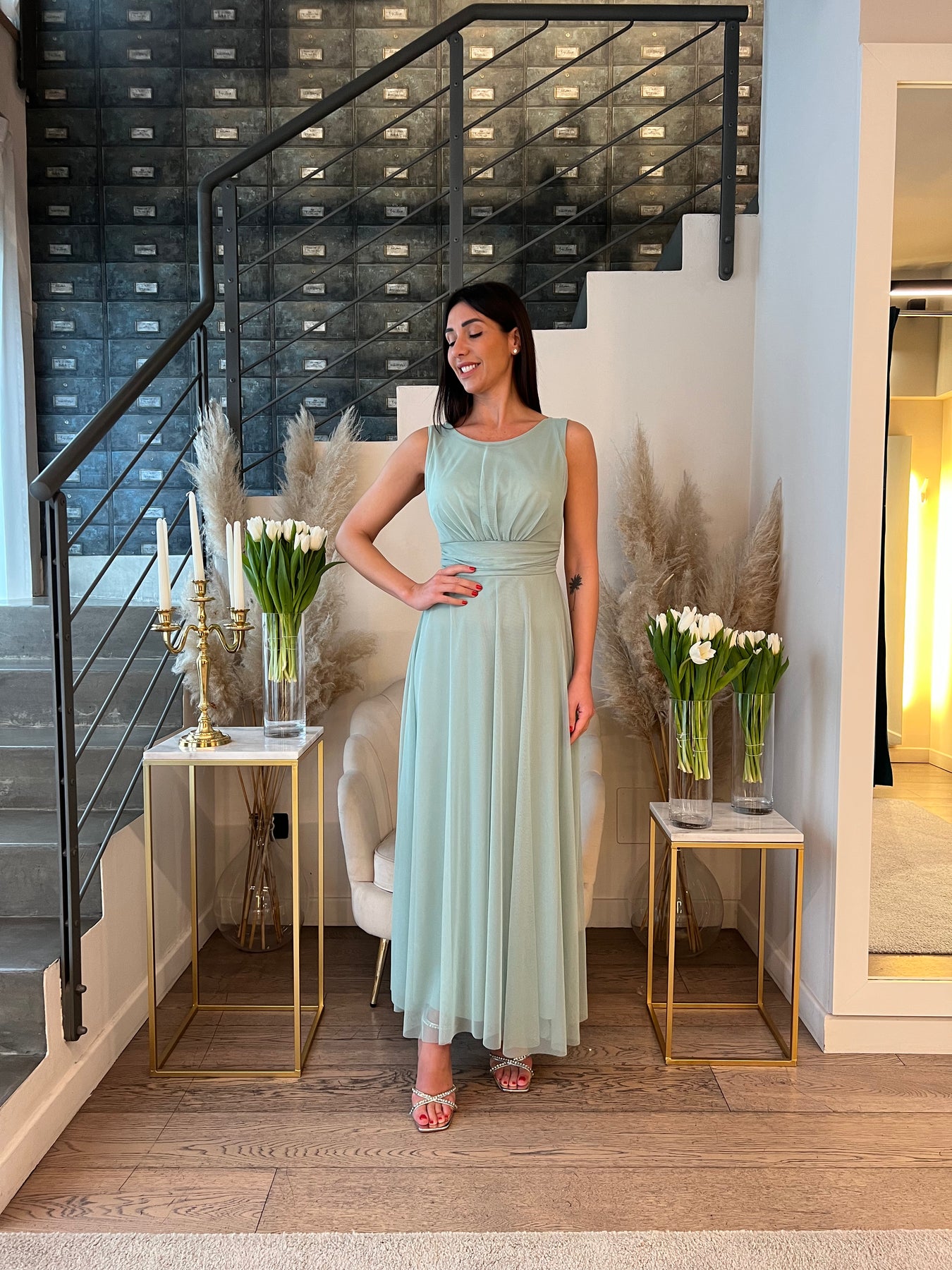 Abito lungo in tulle doppiato con top girocollo a spalla larga con coppette preformate. Pinto vuta segnato e gonna morbida. Veste dalla 40 alla 46