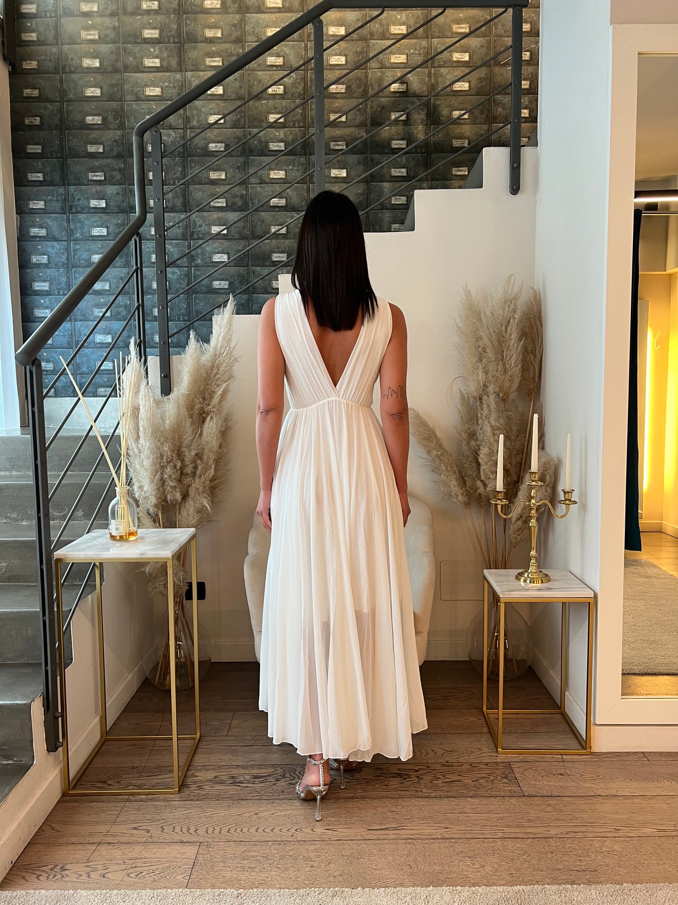 Abito lungo con scollo profondo a V con coppette preformate, punto vita segnato e gonna fluida doppiata a ruota. Veste dalla 40 alla 46