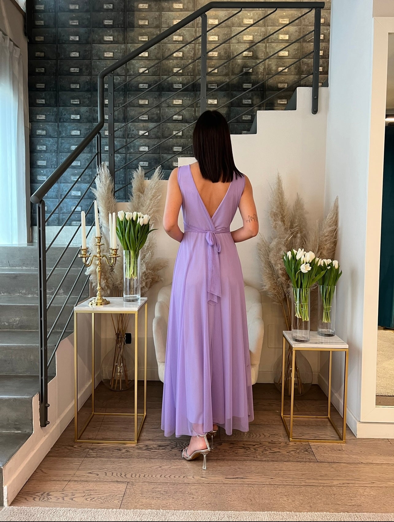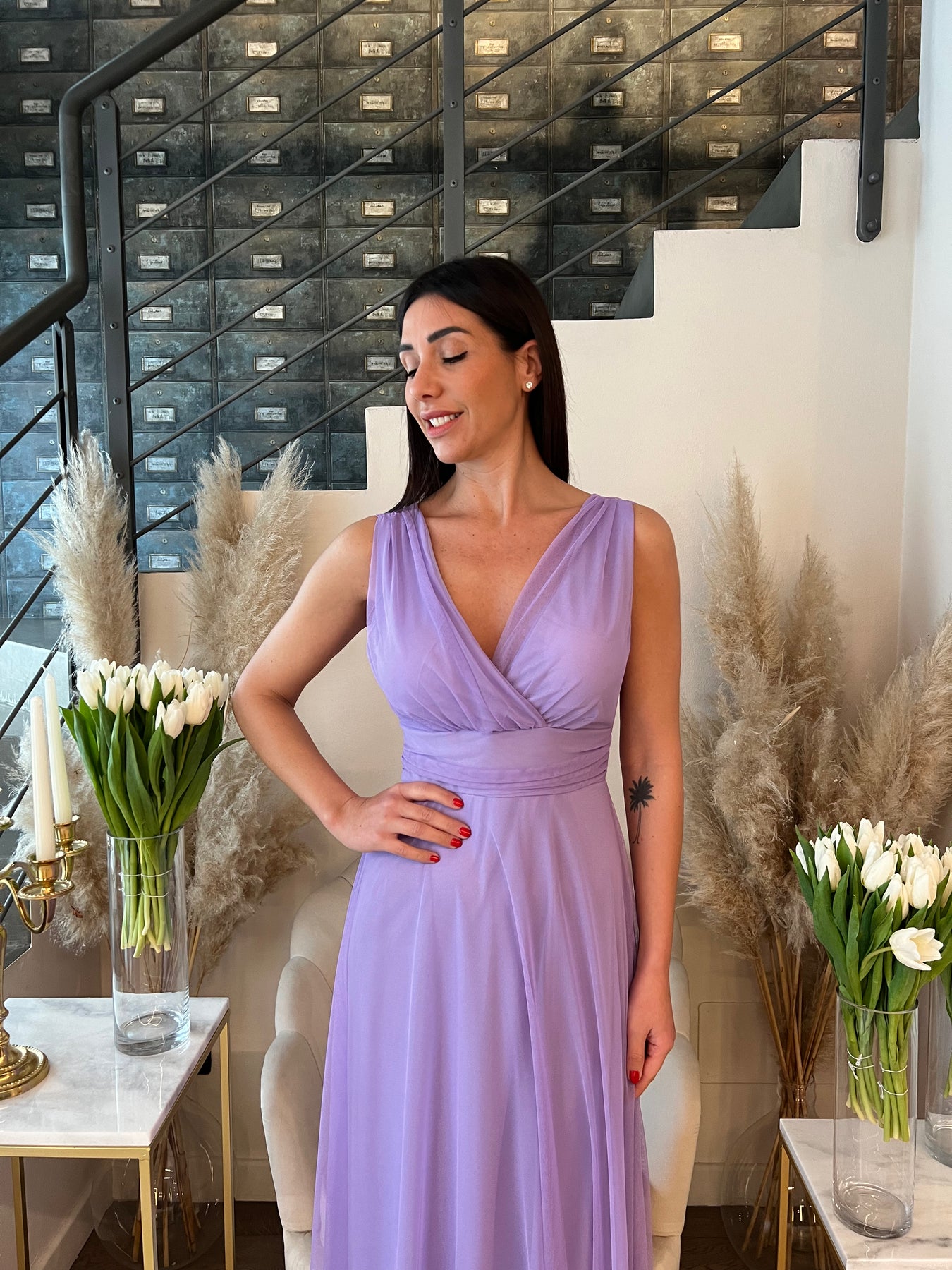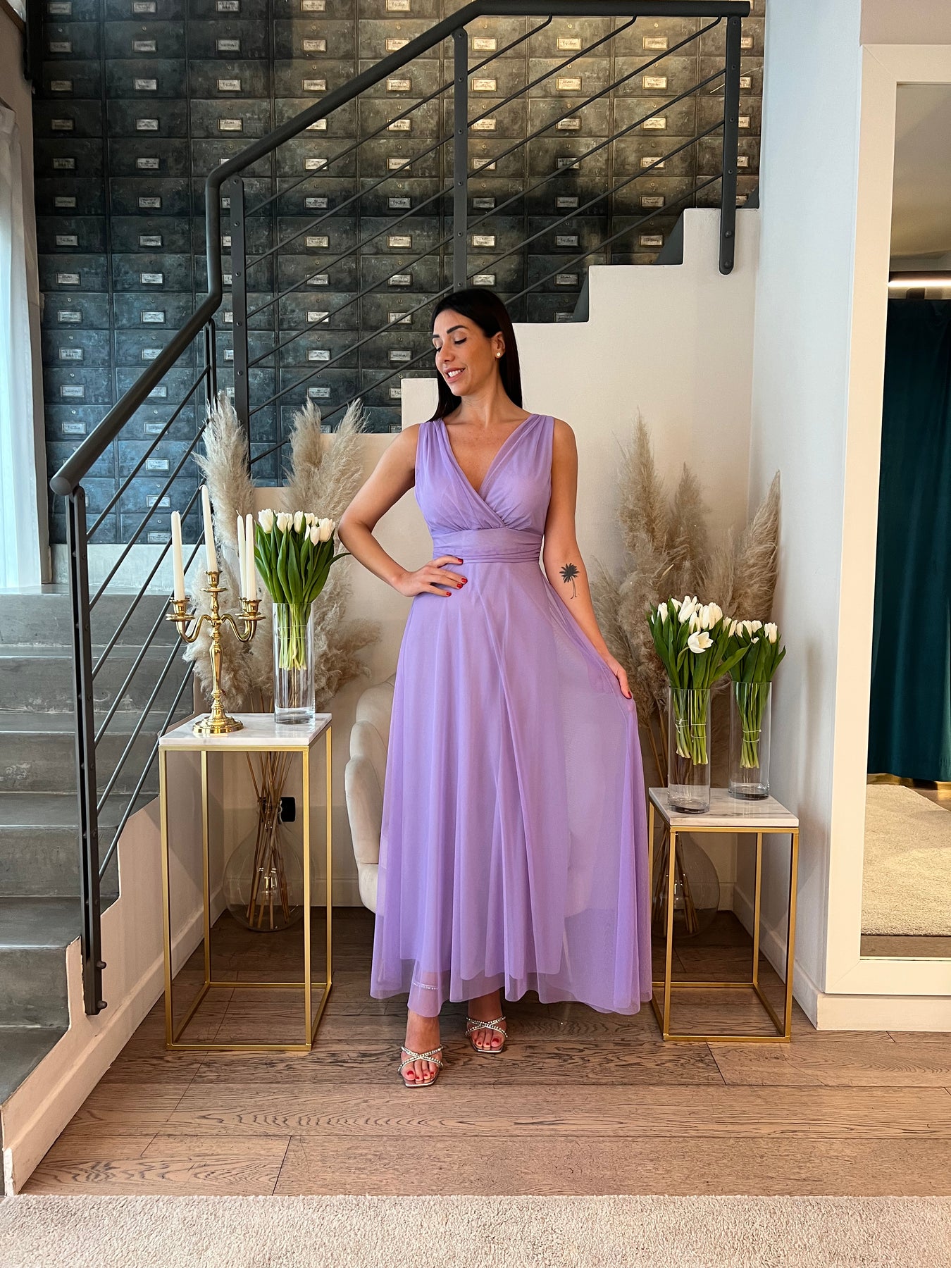 Abito lungo in tulle doppiato morbidissimo. Corpetto senza maniche con scollo incrociato e coppette preformate. Gonna lunga e fascia in vita regolabile nella schiena con un fiocco. Veste dalla 40 alla 46