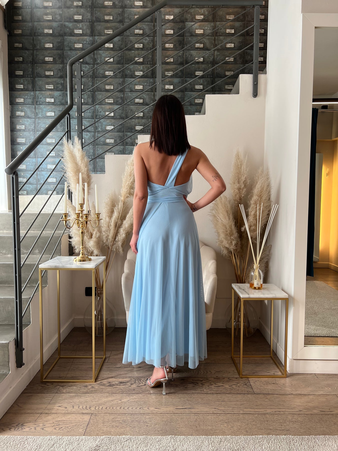 Abito in tulle doppiato con coppette preformate e scollo monospalla. Punto vita segnato e gonna lunga morbida. Veste dalla 40 alla 46
