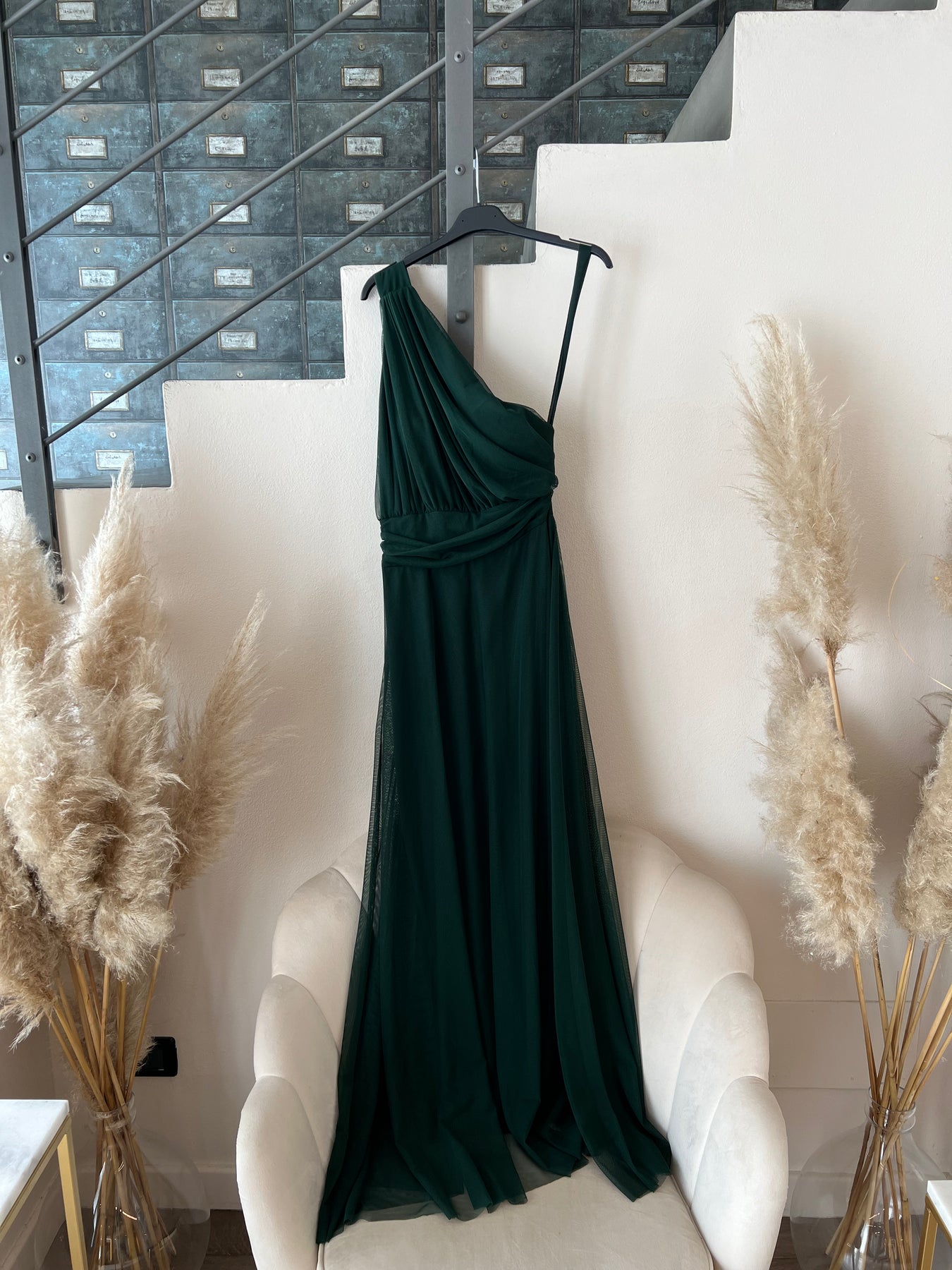Abito in tulle doppiato con coppette preformate e scollo monospalla. Punto vita segnato e gonna lunga morbida. Veste dalla 40 alla 46