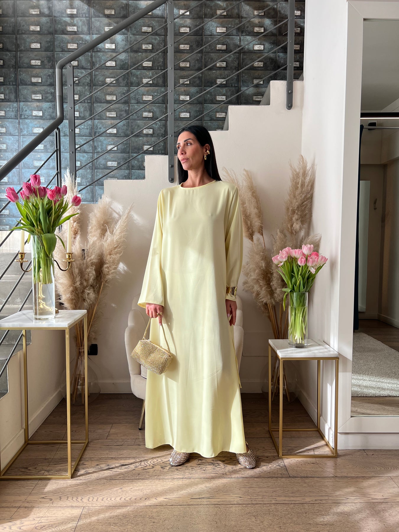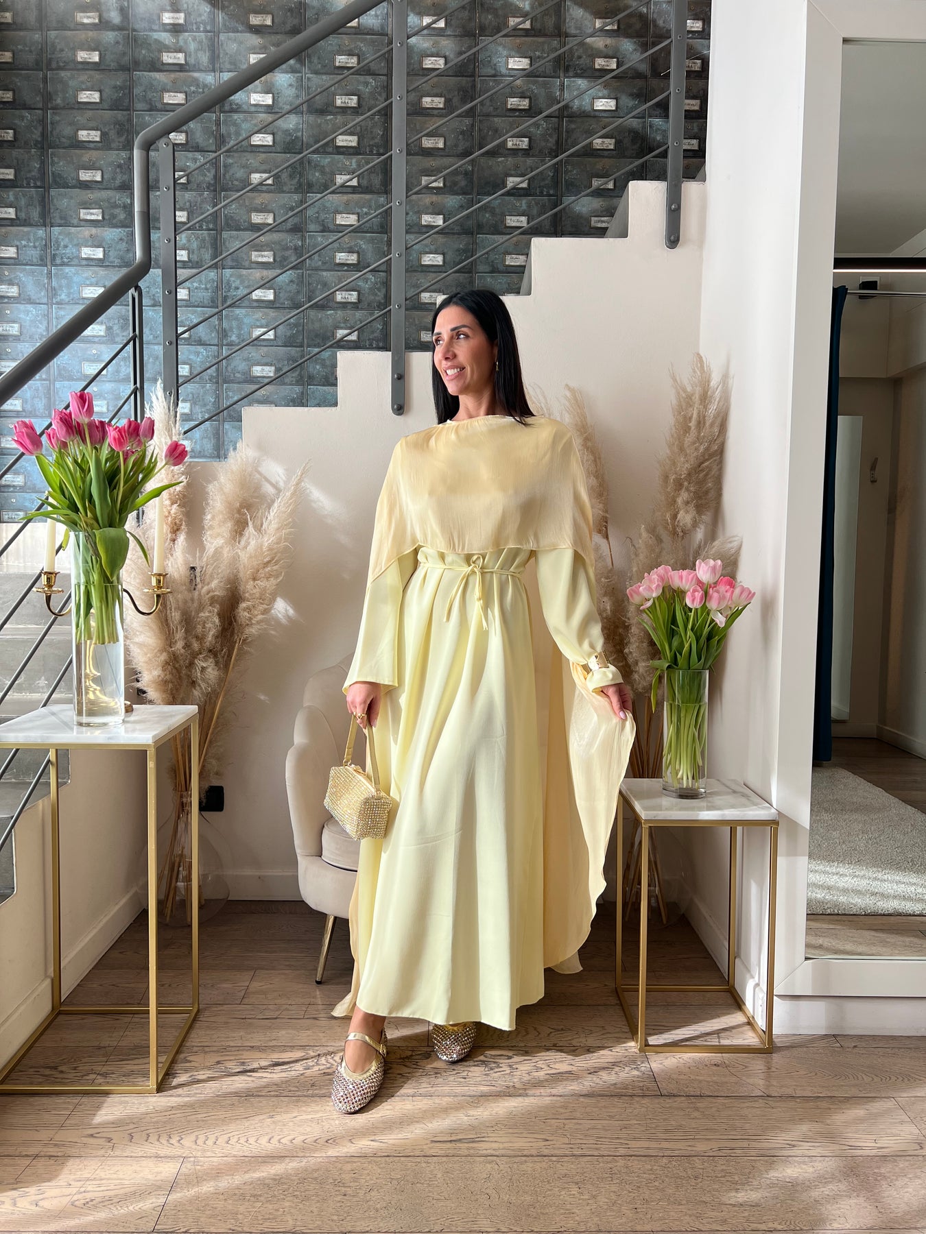 Abito lungo satin girocollo dalla vestibilità over con lacci in vita da legare con fiocchetto e mantella corta davanti e lunga dietro in tessuto semitrasparente. Veste dalla 42 alla 48