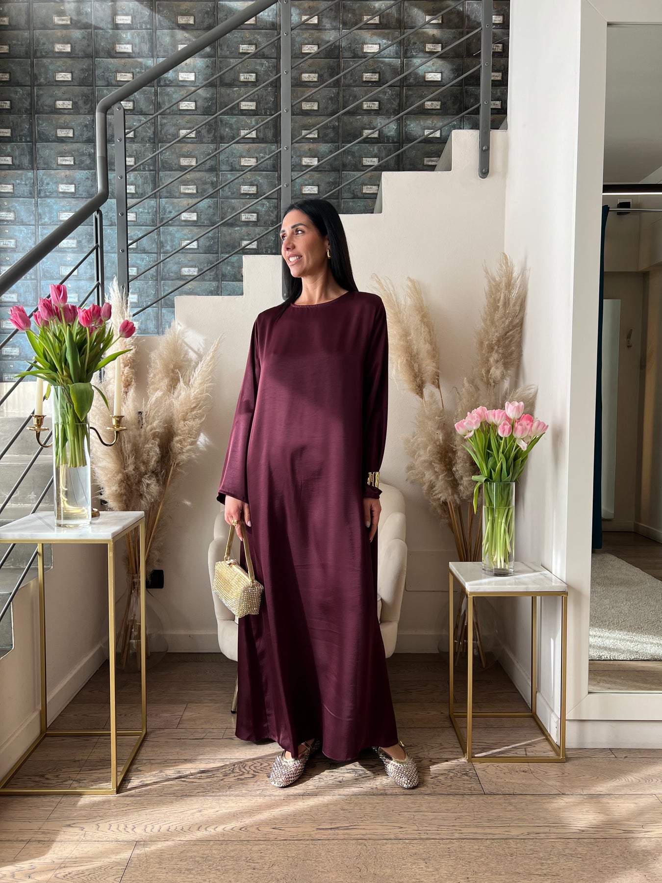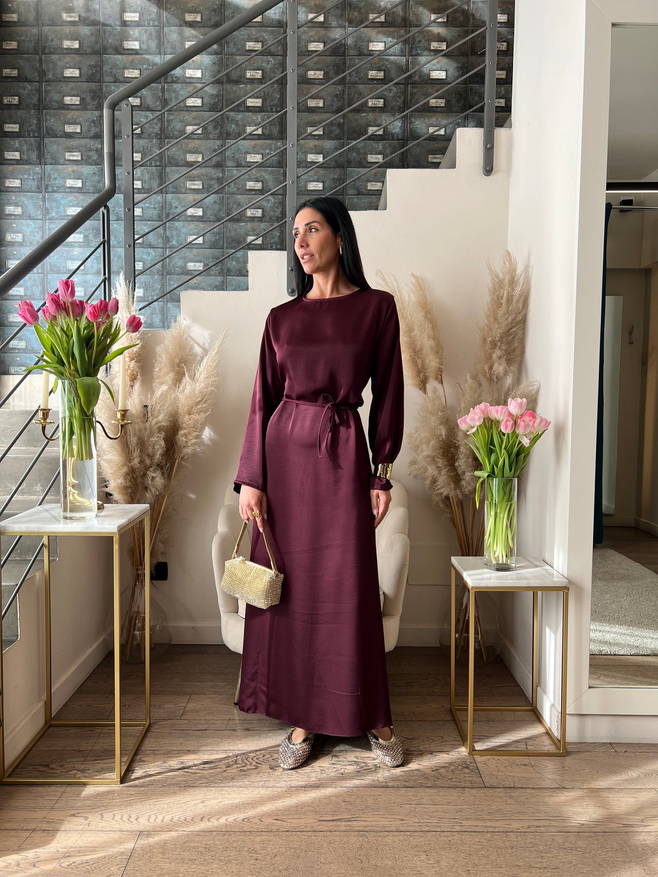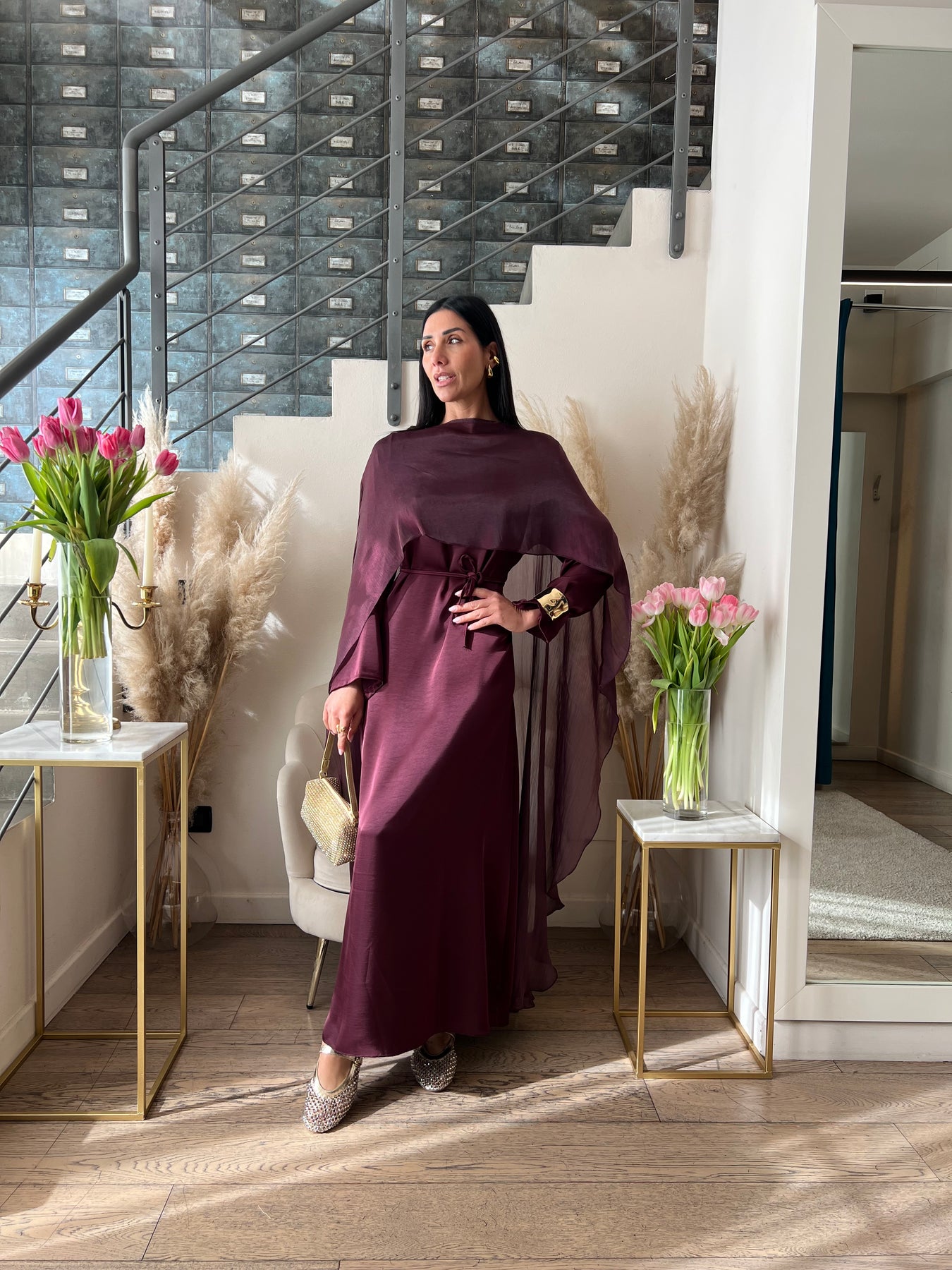 Abito lungo satin girocollo dalla vestibilità over con lacci in vita da legare con fiocchetto e mantella corta davanti e lunga dietro in tessuto semitrasparente. Veste dalla 42 alla 48