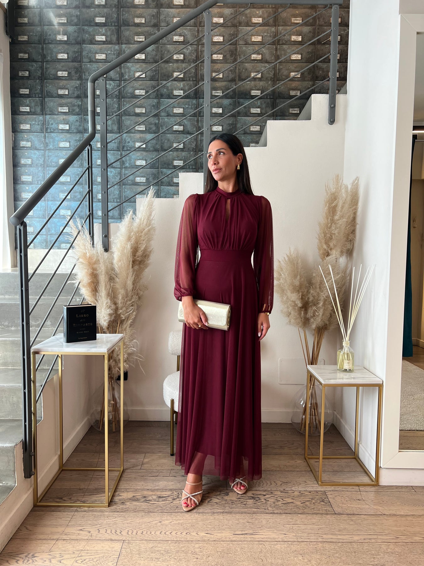 Abito lungo i tulle doppiato con colllo a cinturino e scollo a goccia, punto vita segnato e maniche lunghe. Veste dalla 40 alla 46