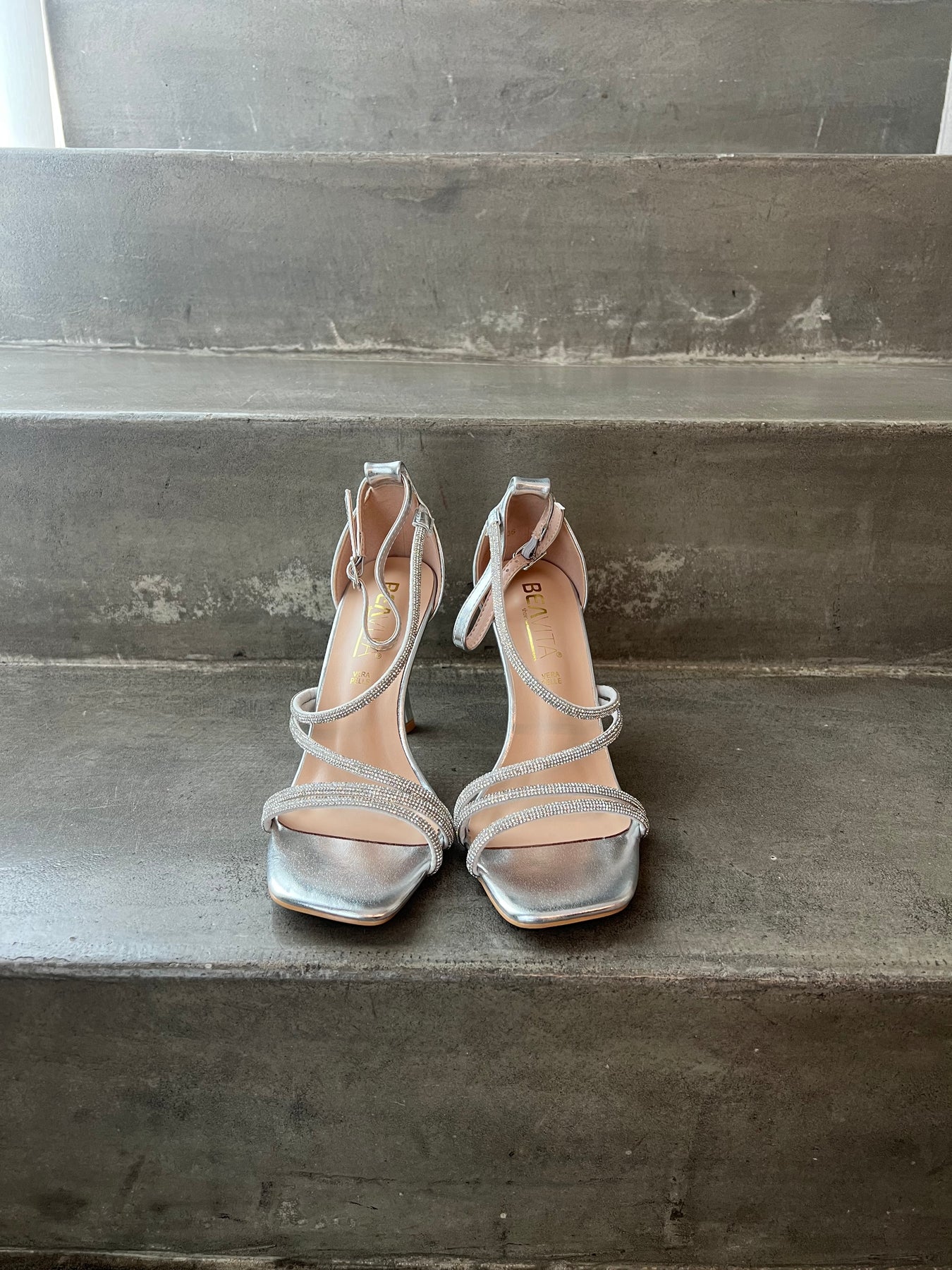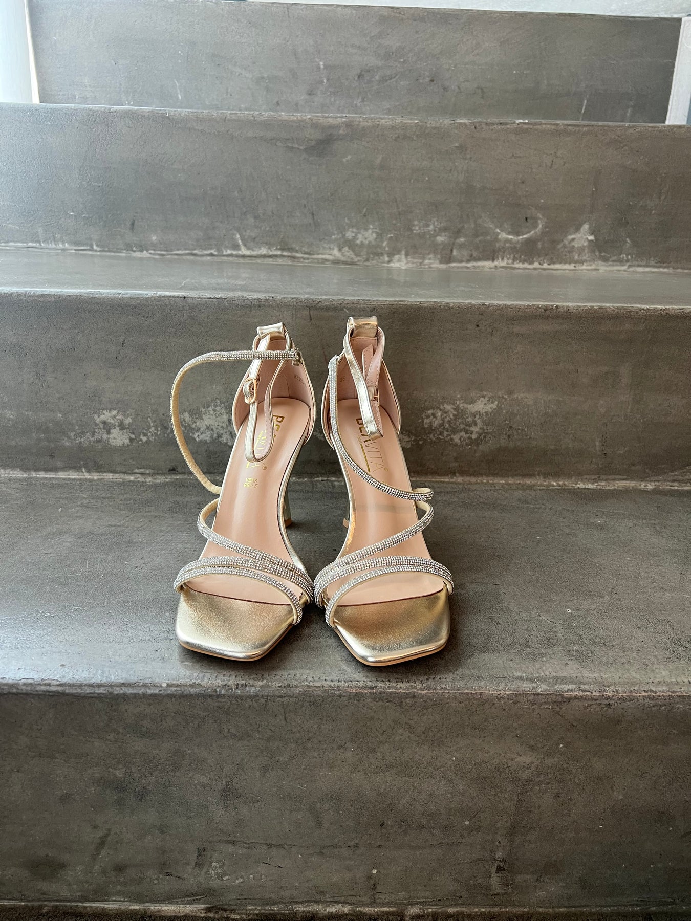 Sandali con fasce in strass e laccio alla caviglia , tacco h8cm La calzata é regolare, consigliamo il numero portato abitualmente