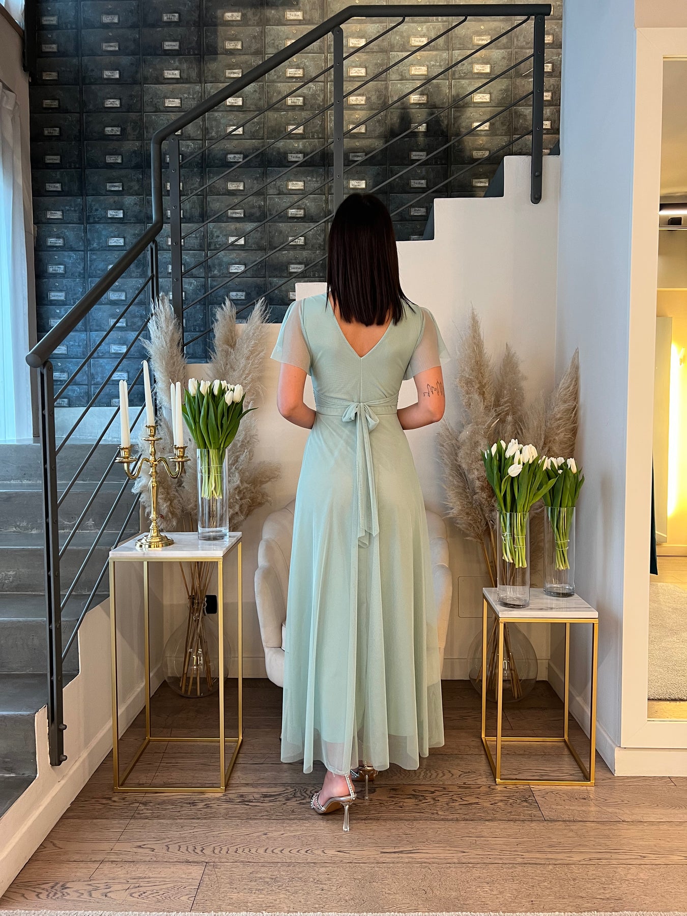 Abito lungo in tulle doppiato morbidissimo. Corpetto con scollo incrociato, coppette preformate  e maniche a petalo. Gonna lunga e fascia in vita regolabile nella schiena con un fiocco. Veste dalla 40 alla 46