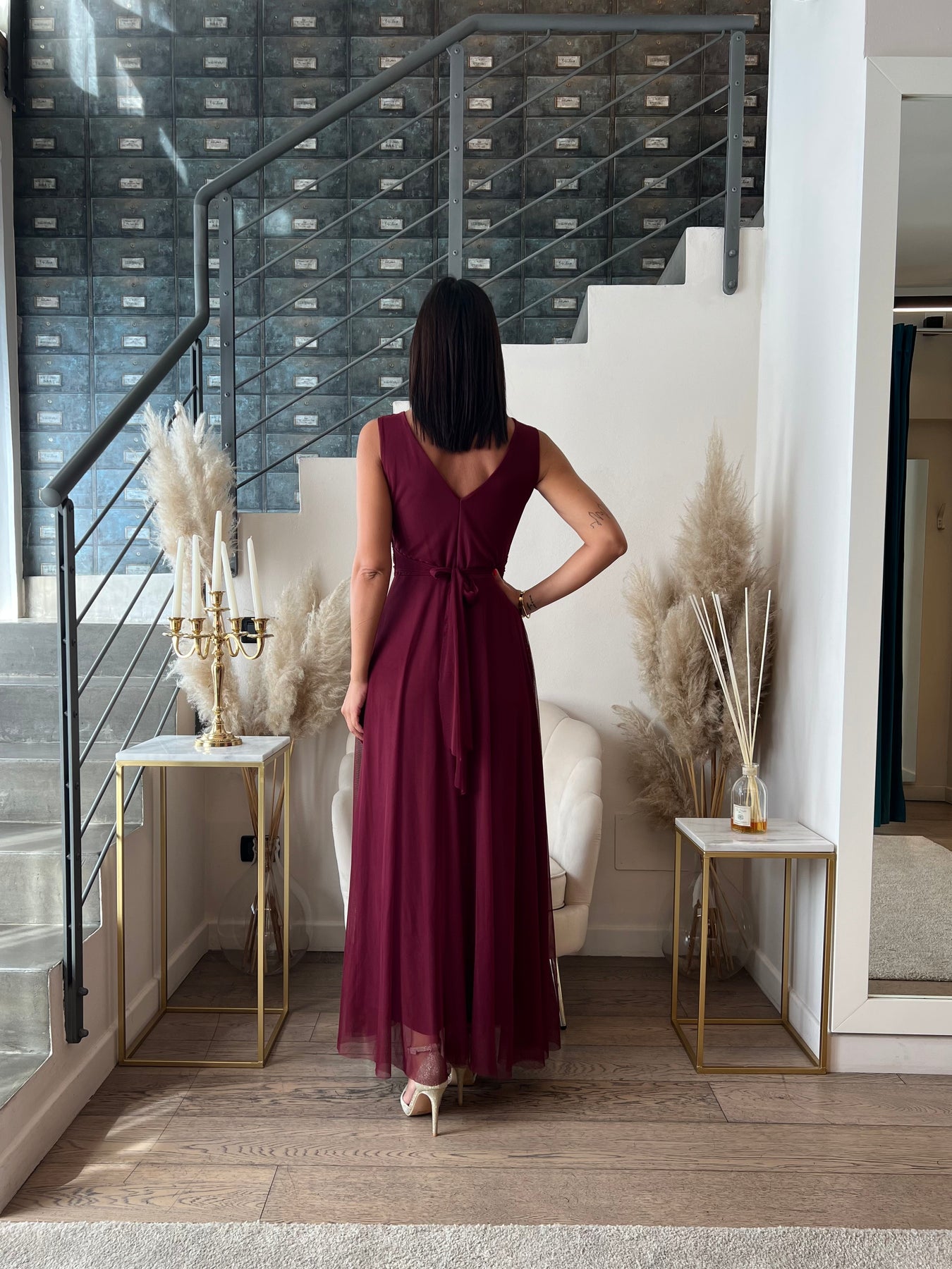 Abito lungo in tulle doppiato con top girocollo a spalla larga con coppette preformate. Pinto vuta segnato e gonna morbida. Veste dalla 40 alla 46