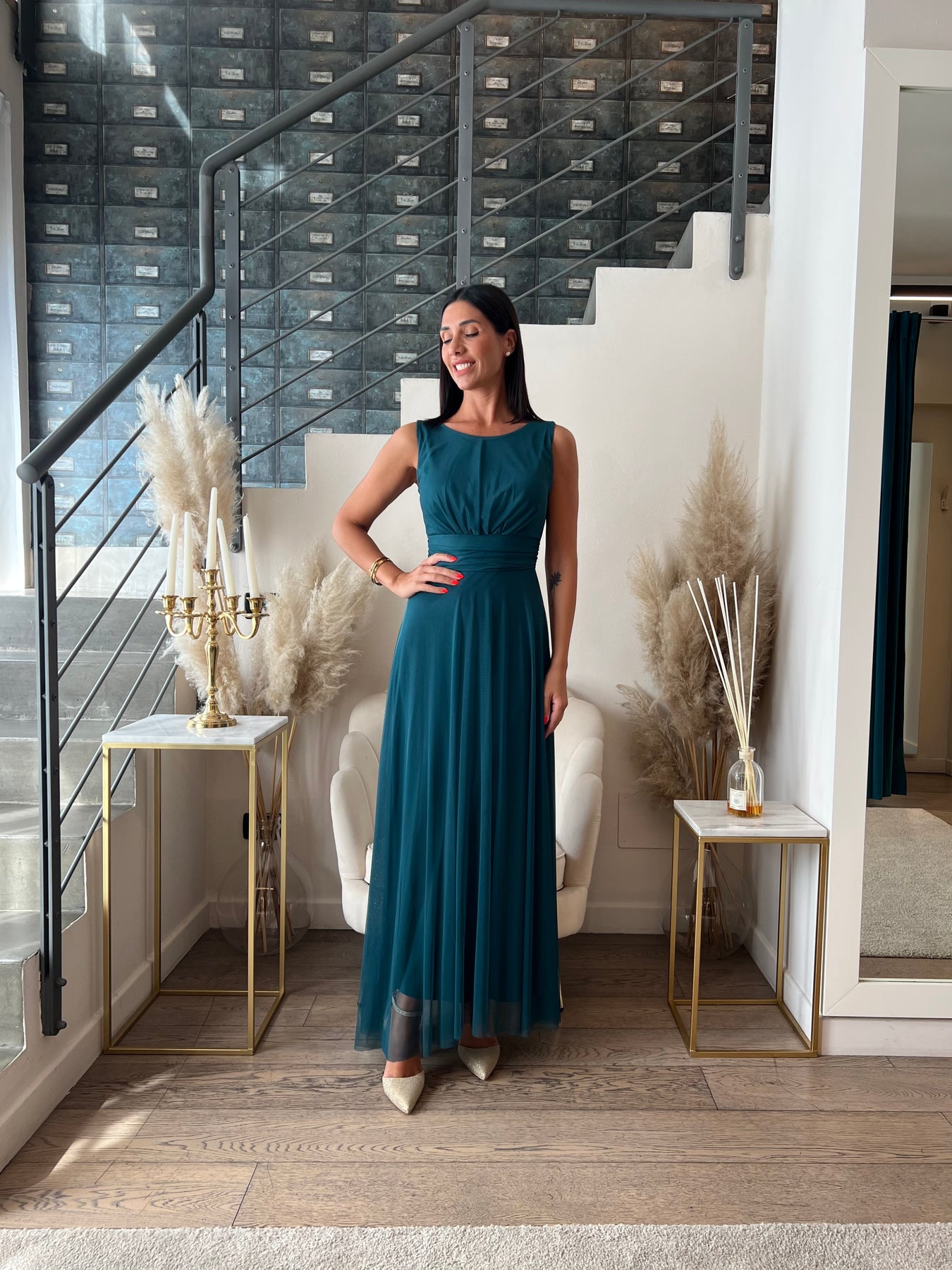 Abito lungo in tulle doppiato con top girocollo a spalla larga con coppette preformate. Pinto vuta segnato e gonna morbida. Veste dalla 40 alla 46