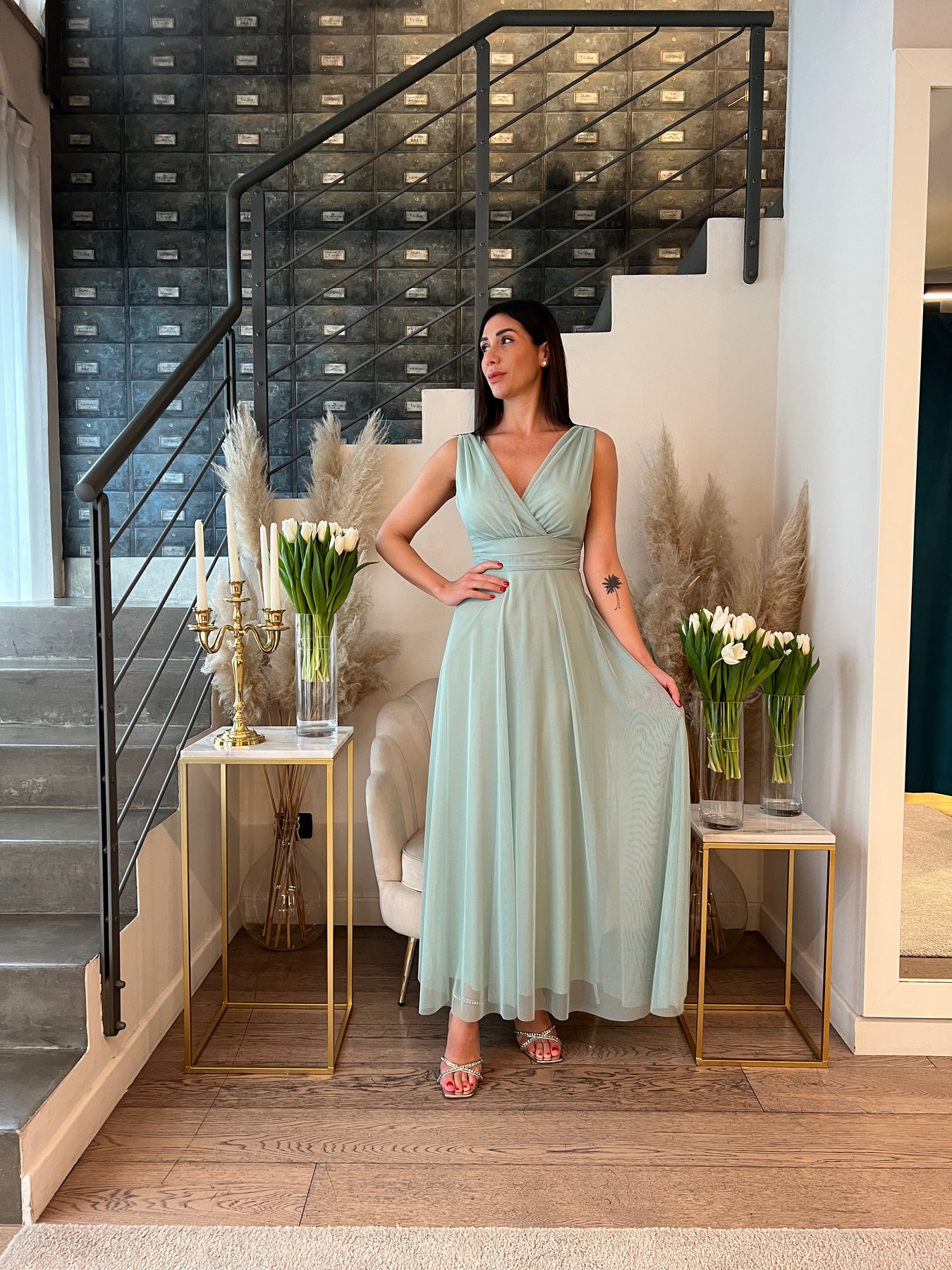 Abito lungo in tulle doppiato morbidissimo. Corpetto senza maniche con scollo incrociato e coppette preformate. Gonna lunga e fascia in vita regolabile nella schiena con un fiocco. Veste dalla 40 alla 46