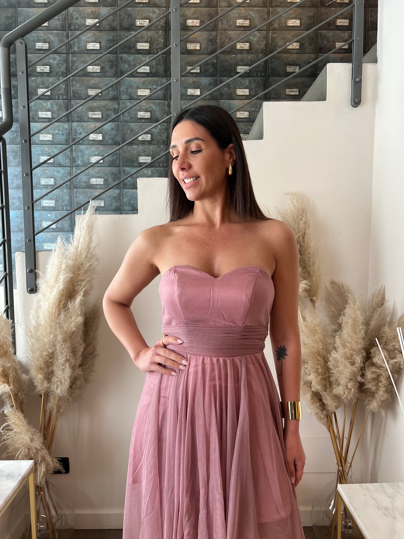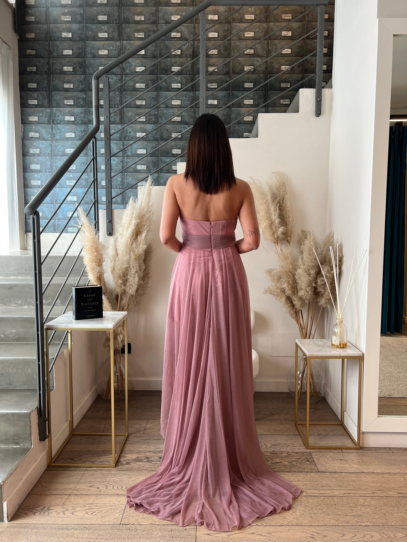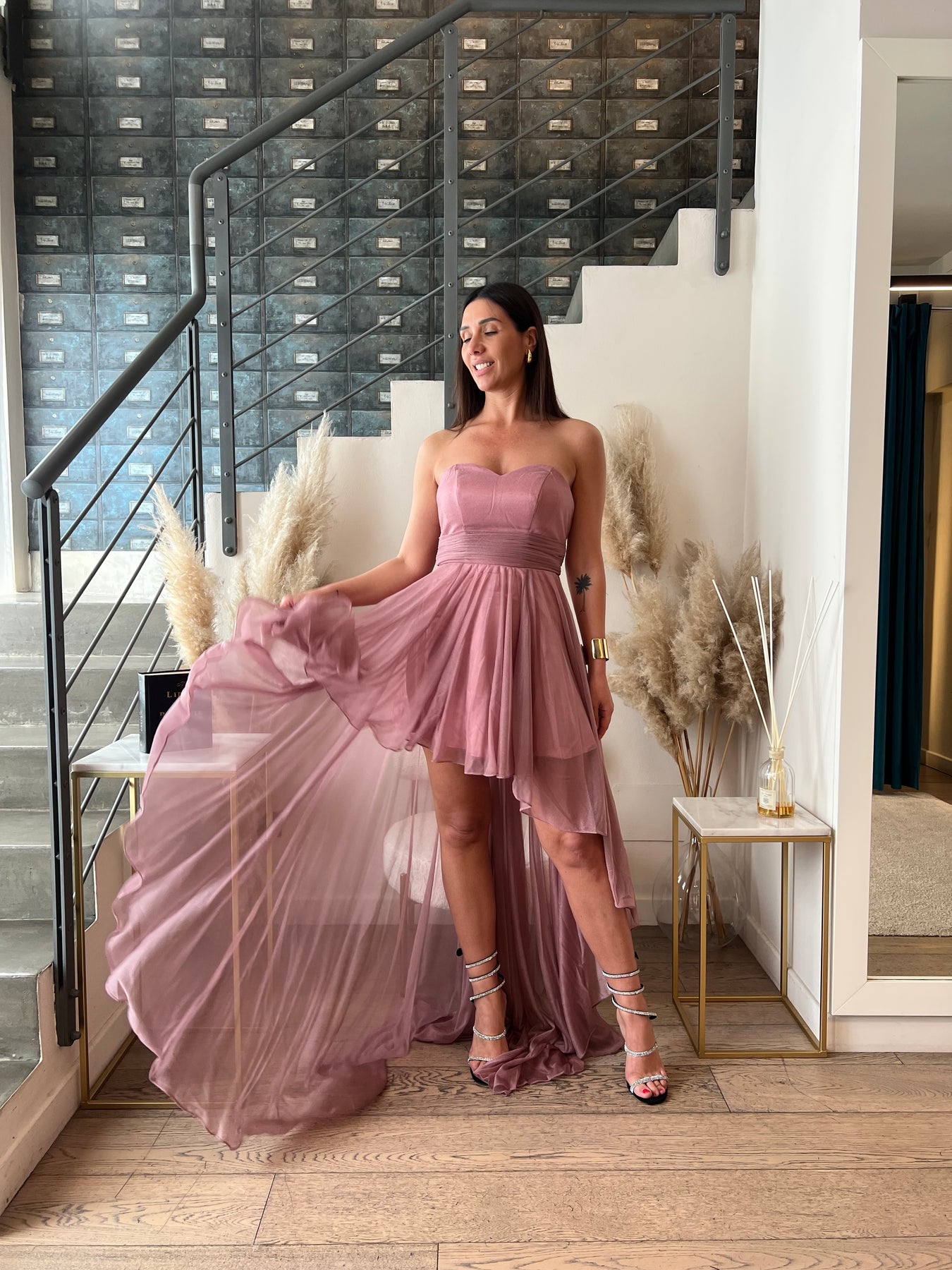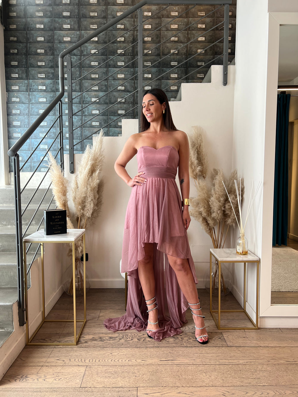 Abito elegante con scollo a cuore, coppette preformate, chiusura con zip nella schiena e gonna morbida doppiata corta davanti e lunga nel retro.