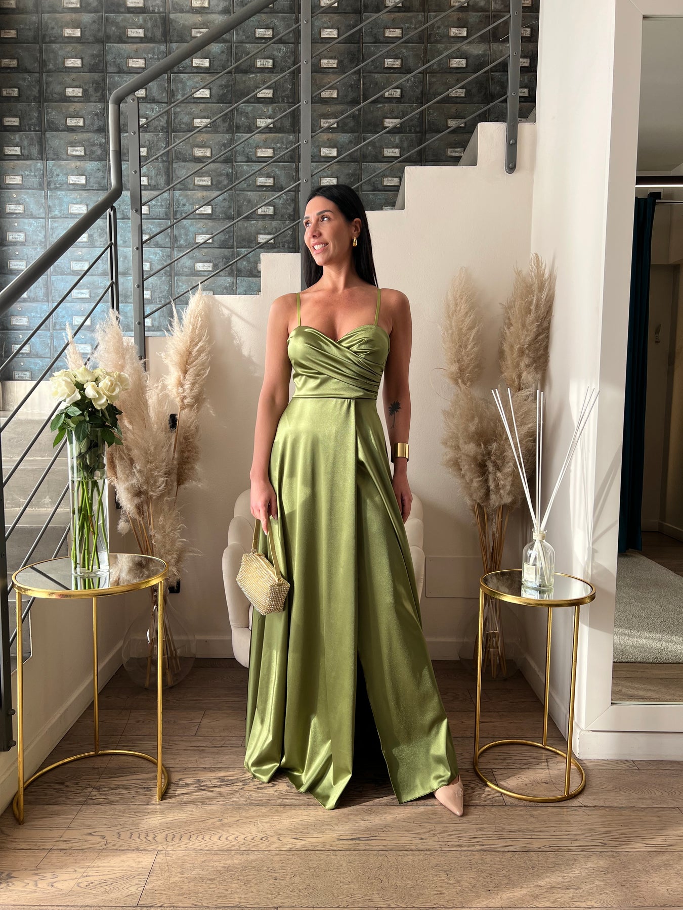 Abito lungo satin con spallini sottiii regolabili, top drappeggiato con coppette preformate, chiusura con zip nella schiena e gonna ampia sovrapposta che crea uno spacco nel movimento. Veste dalla 40 alla 44
