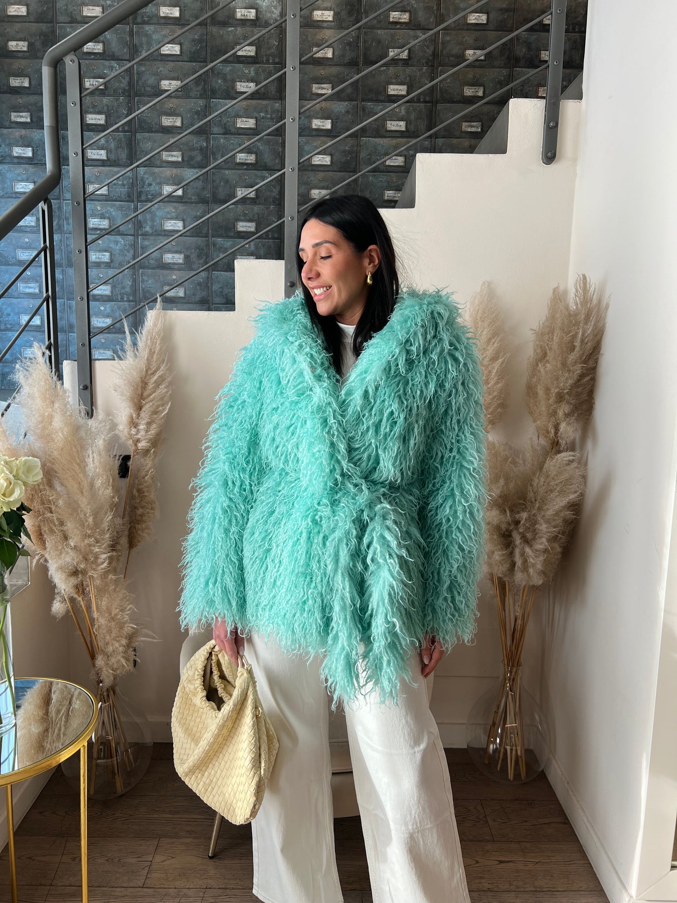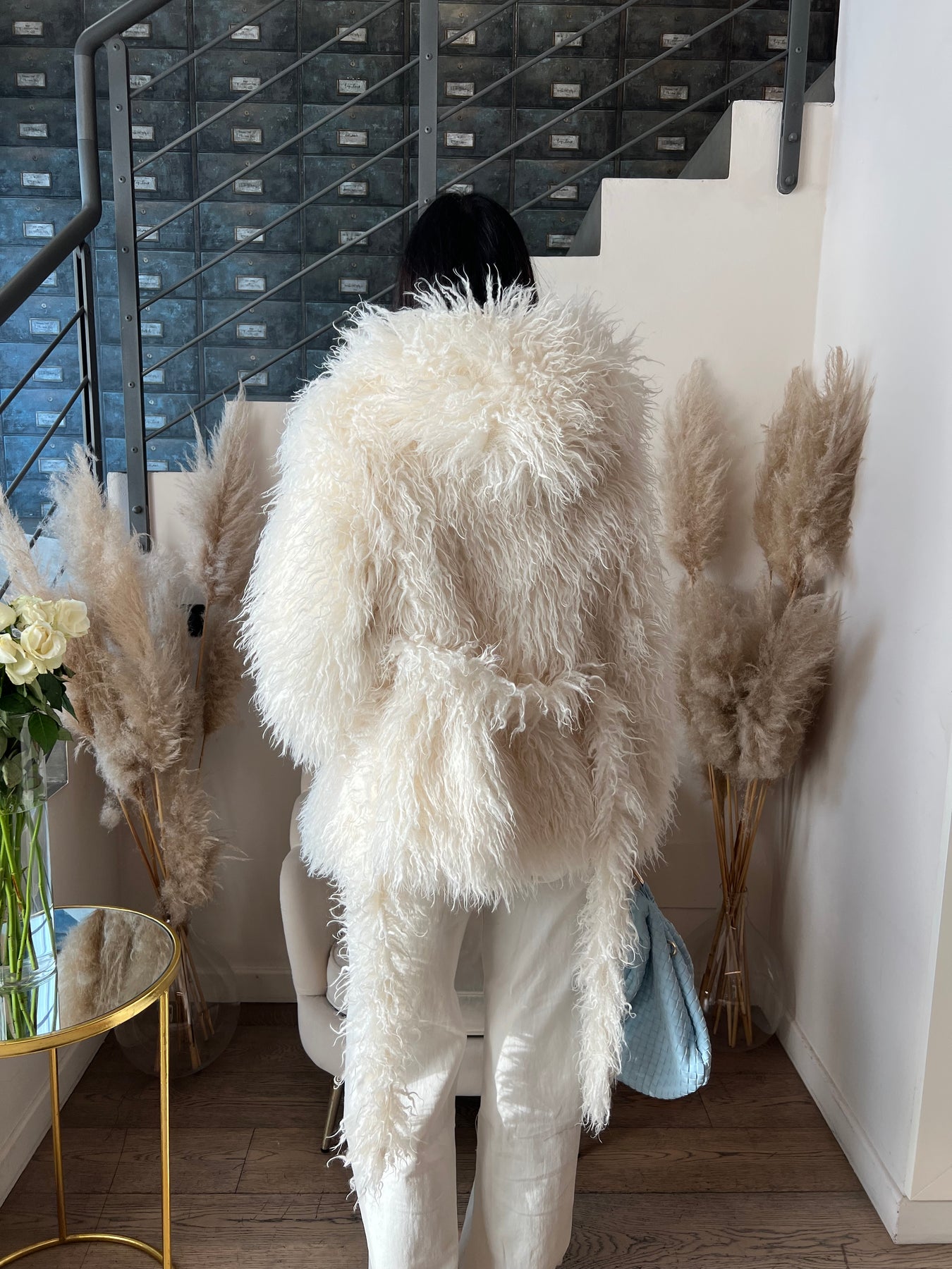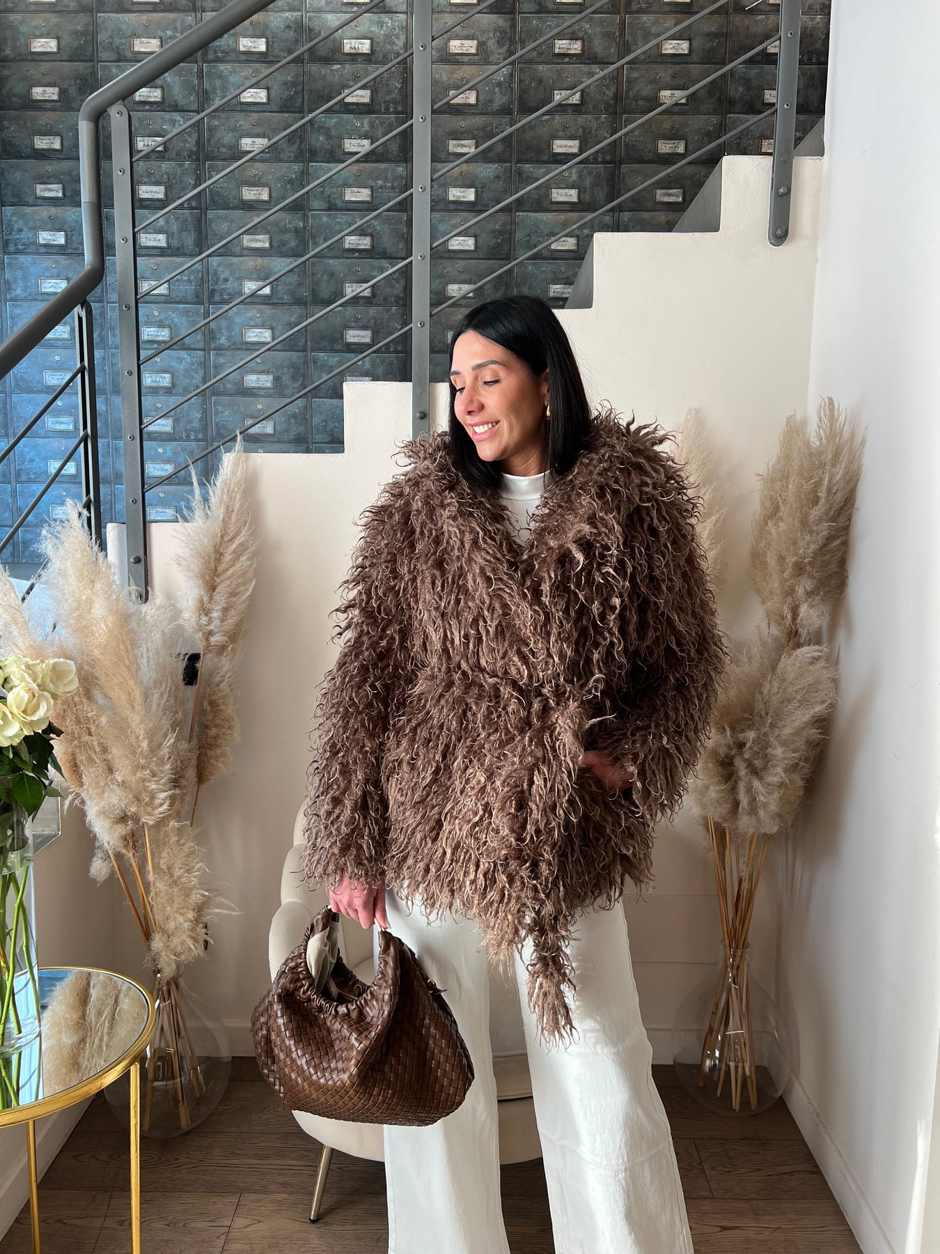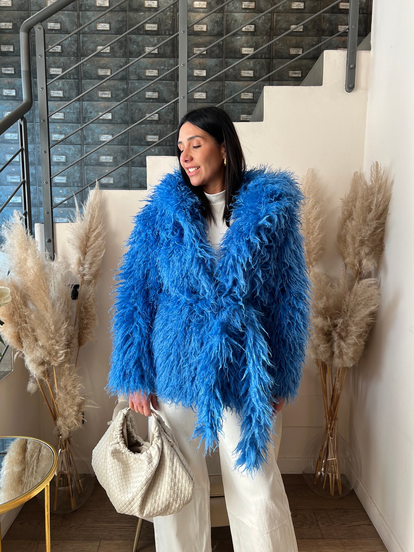 Ecofur a pelo lungo ondulato foderata dalla modellatura dritta con cappuccio, chiusura con bottoni e pressione e cintura. Veste dalla 40 alla 44 Nelle fotografie indossata da tg42 h1,72