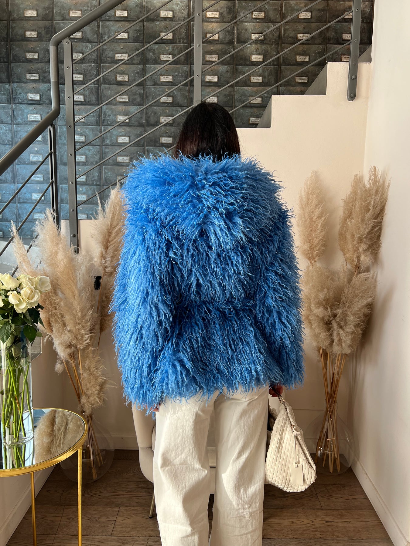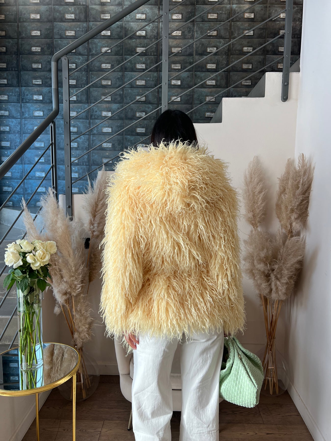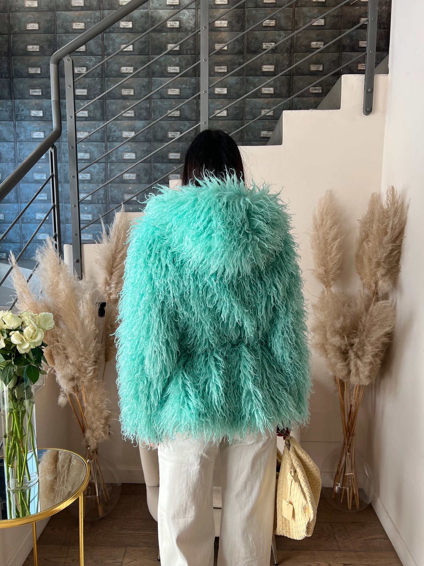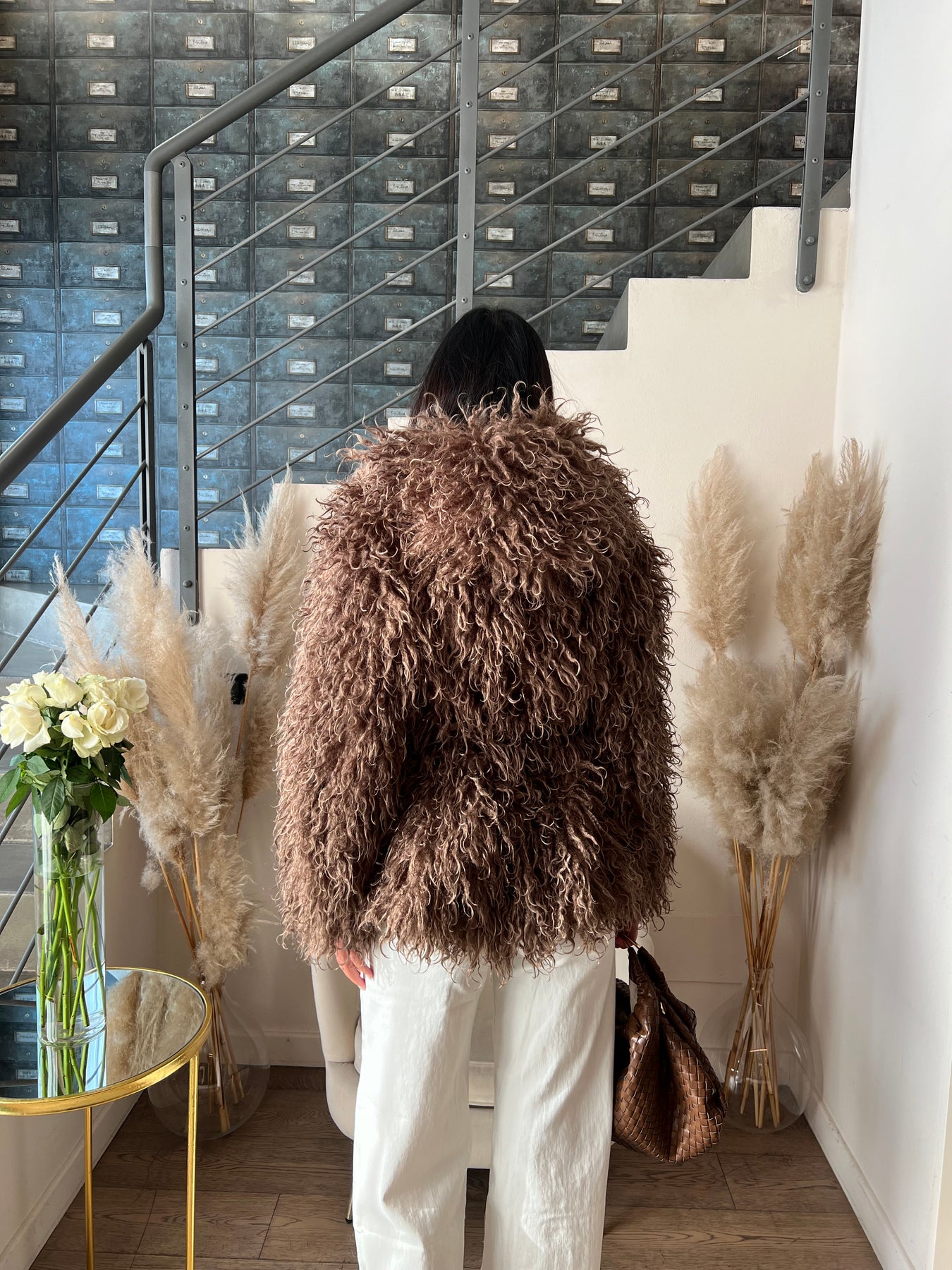 Ecofur a pelo lungo ondulato foderata dalla modellatura dritta con cappuccio, chiusura con bottoni e pressione e cintura. Veste dalla 40 alla 44 Nelle fotografie indossata da tg42 h1,72